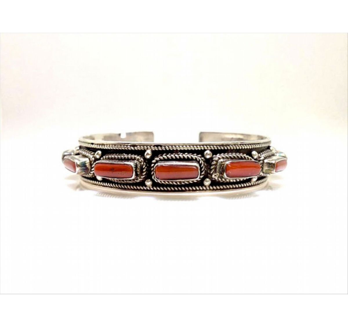 Vintage Handmade One Row of Red Coral with Detailed Hand Work around each stone 45.74 approx grams including gems great for stacking bracelets