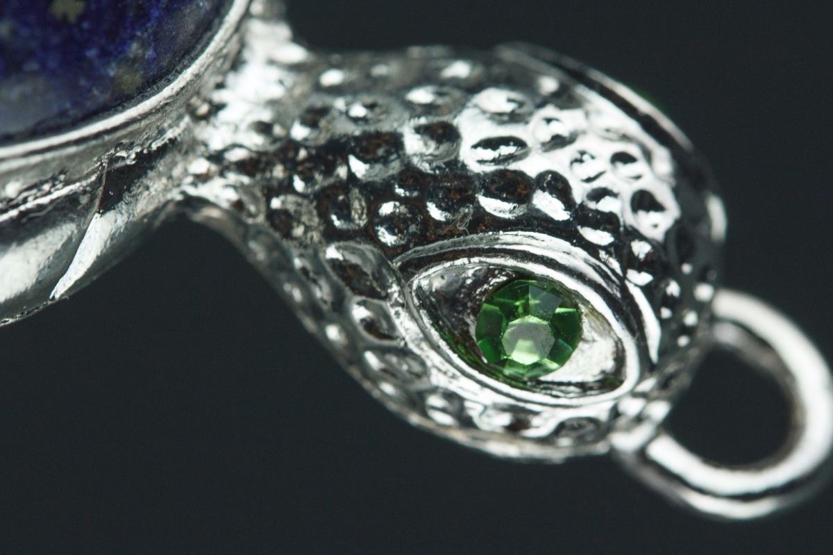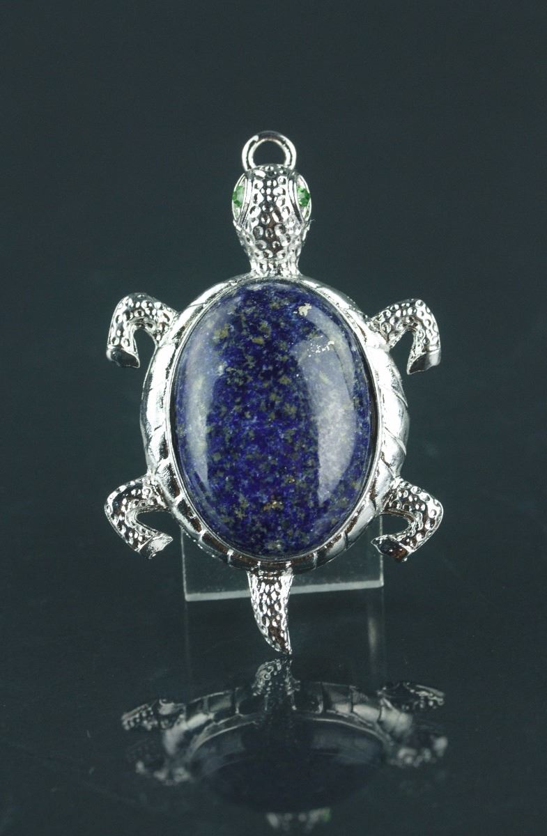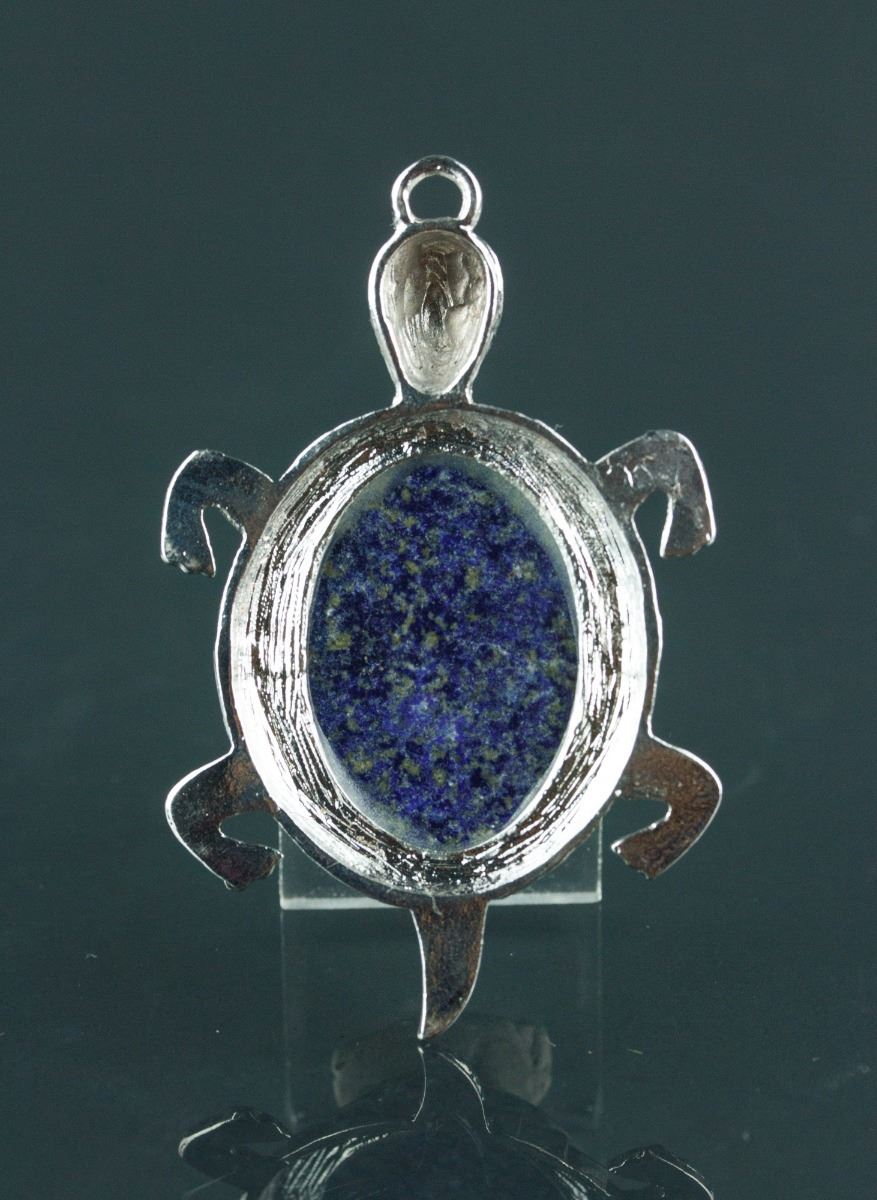 Sterling silver pendant; in shape of a turtle; inlaid with oval-cut lapis lazuli; W: 4 cm, L: 6 cm, 23 grams