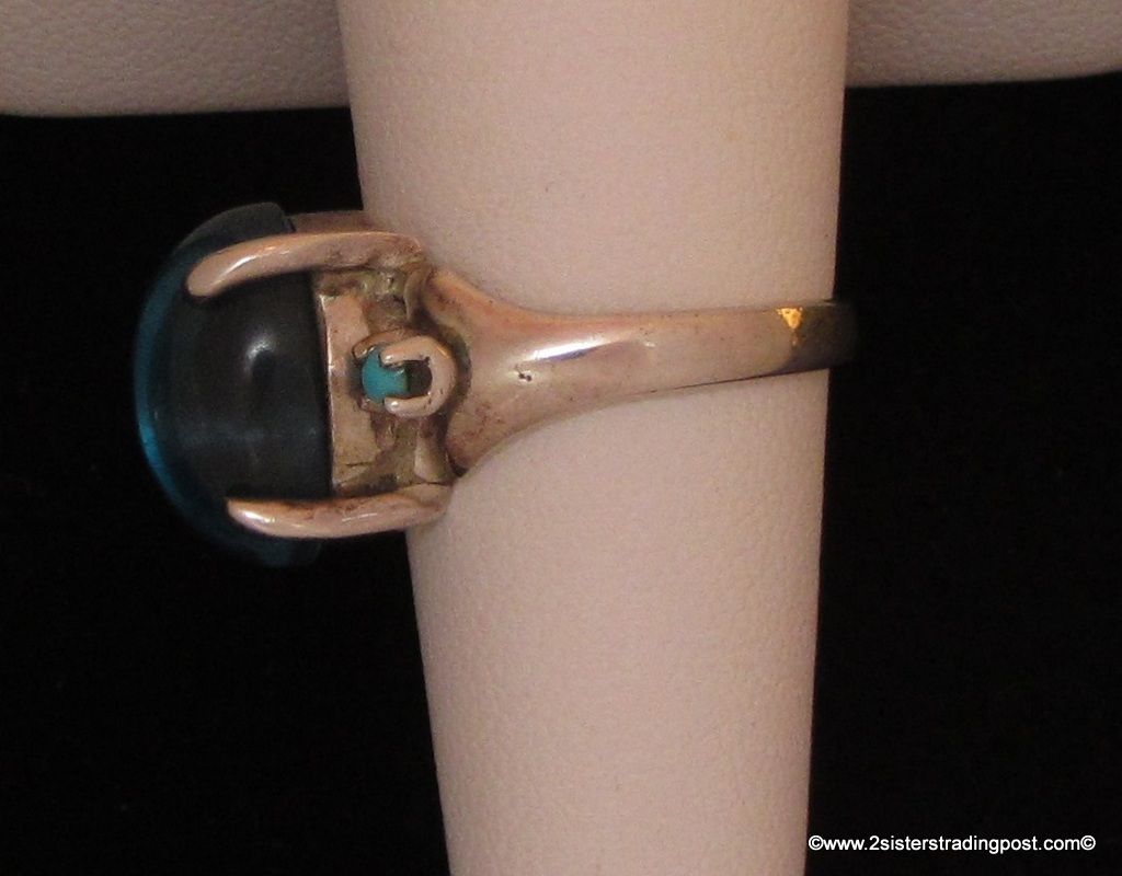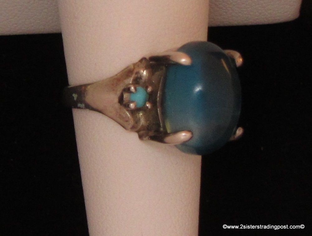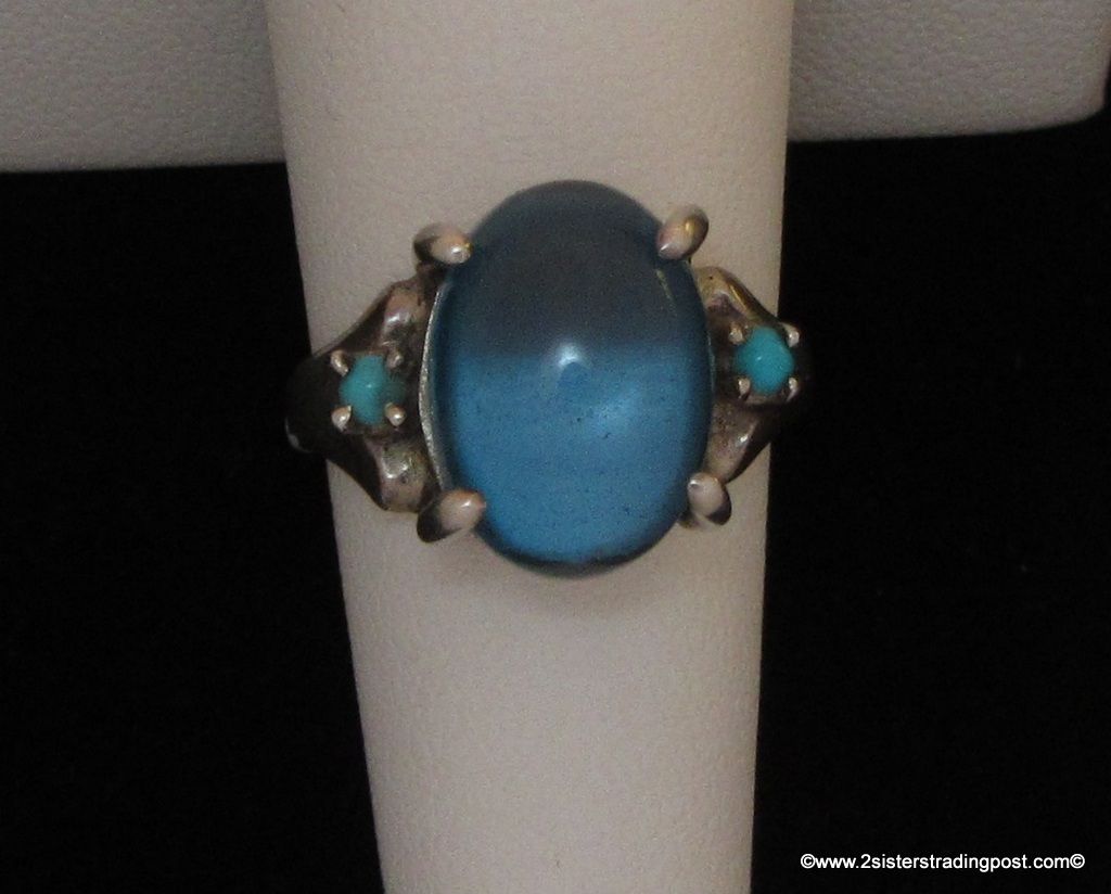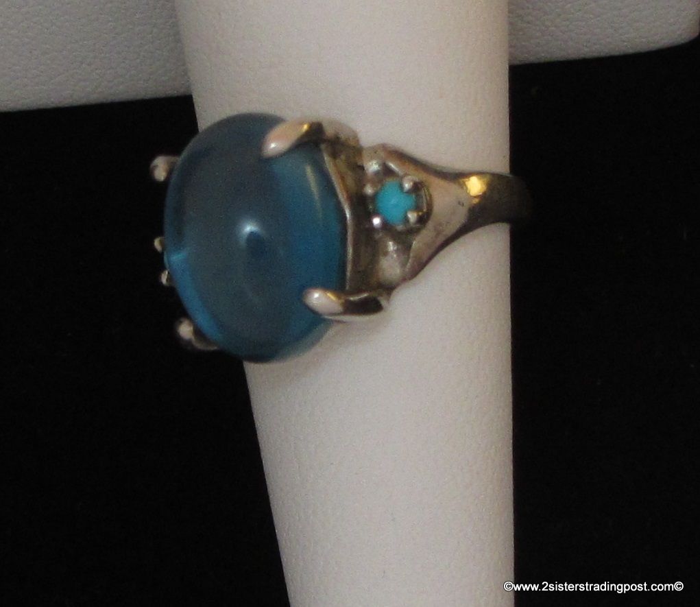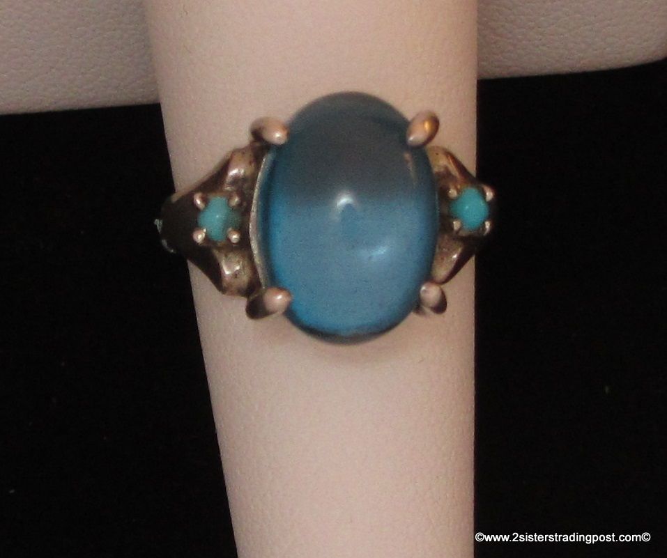 Size 7.25 Aqua blue cabochon cut spinel is set with two small turquoise stones one on each side in a simple 4 prong sterling setting. The spinel is approximately 8.5 carats and measures approximately 14 mm x 10 mm x 5.9 mm each of the turquoise stones measure 2.4 mm diameter. Overall ring measures 14 mm tall x 16 mm wide. The ring is not stamped sterling or hallmarked NOTE: piece has been tested and is silver.