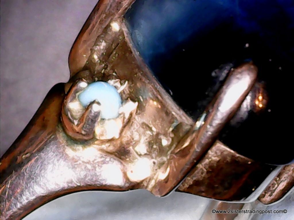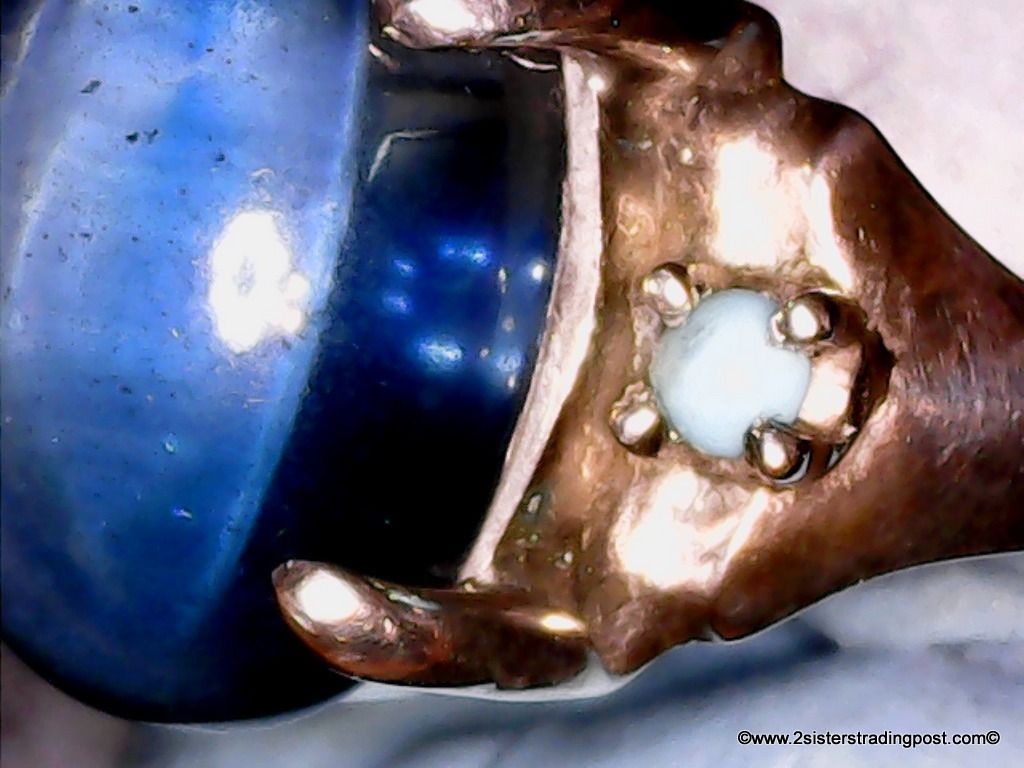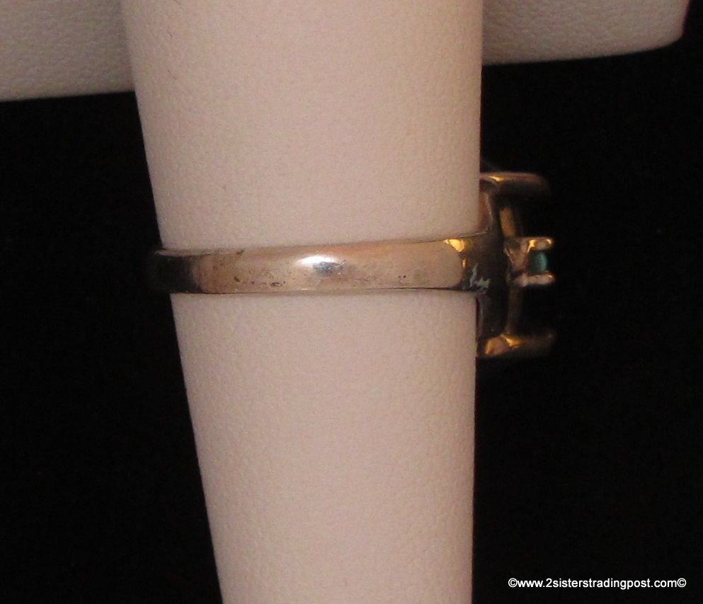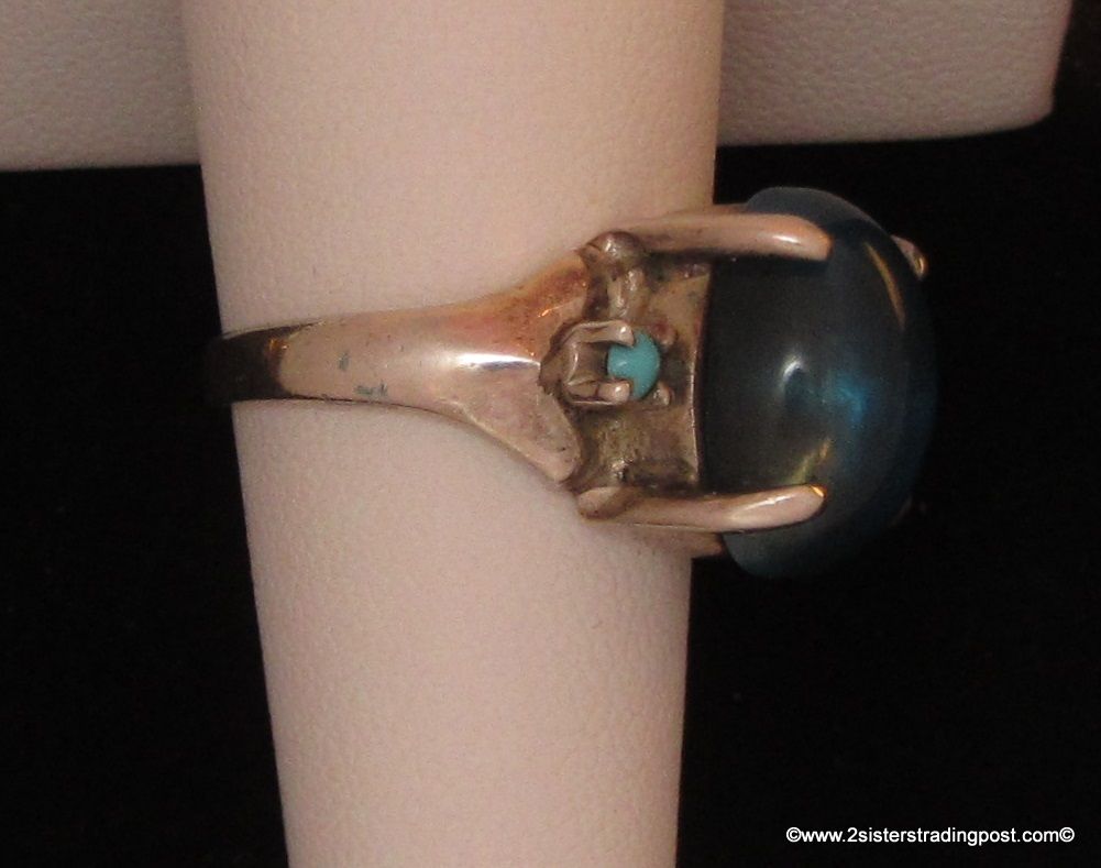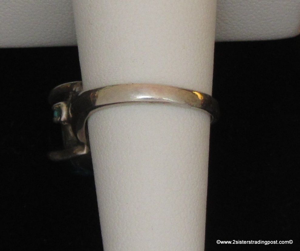 Size 7.25 Aqua blue cabochon cut spinel is set with two small turquoise stones one on each side in a simple 4 prong sterling setting. The spinel is approximately 8.5 carats and measures approximately 14 mm x 10 mm x 5.9 mm each of the turquoise stones measure 2.4 mm diameter. Overall ring measures 14 mm tall x 16 mm wide. The ring is not stamped sterling or hallmarked NOTE: piece has been tested and is silver.