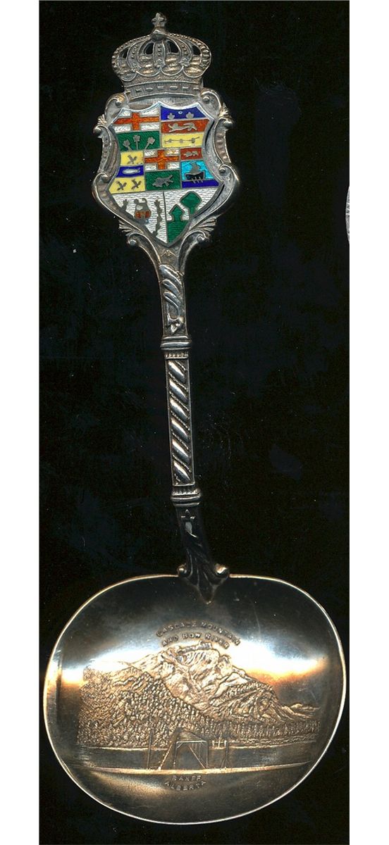 Sterling Spoon; 1907 Cascade Mountain and Bow River Alberta issue. Spoon shows Crown with Provincial Emblems & Colours. The bowl has an embossed mountain and bridge scene. A nice issue with no visual problems.