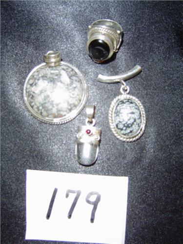 Sterling Silver and Semi-precious Jewelry. Oval Snowflake Obsidian Pendants - .87" X 1", Round black/pink/white stone pendant - 1.5" accross, Clear Quartz Crystal Tounge Point w/ Garnet accent stone - .75" X .5" and Onyz Poison/Locket Ring