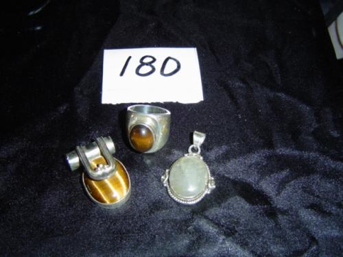 Sterling Silver and Semi-precious Jewelry. Rutilated Quartz Pendant - 1" X 1.25" w/ loop, Heavy SS/Tigers Eye Pendant - 1" X 1.5" and Tigers Eye Ring.