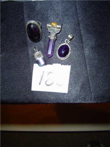 Sterling Silver and Semi-precious Jewelry. Aqua Aura Quartz Crystal Tounge Point w/ Amethyst accent stone - .75" X .5"3, Amethyst Crystal Point with Tigers Eye Accent Stone - .75" X 2", Oval Amethyst Pendant - .75" X 1" and Amethyst Stone (.75" X 1.25") Ring