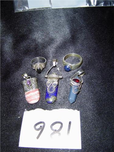 Sterling Silver and Semi-precious Jewelry. Blue Quartz Crystal Point Pendants w/ Garnet accent stone - .5" X 1.25", Blue Lapis Tongue Point with Opal accent stone - .75" X 1.75", Pink Rhodochrosite Tongue Point w/ Amethyst accent stone and 2 Rings, both with small stones. One Lapis and one Amethyst Poison Ring.