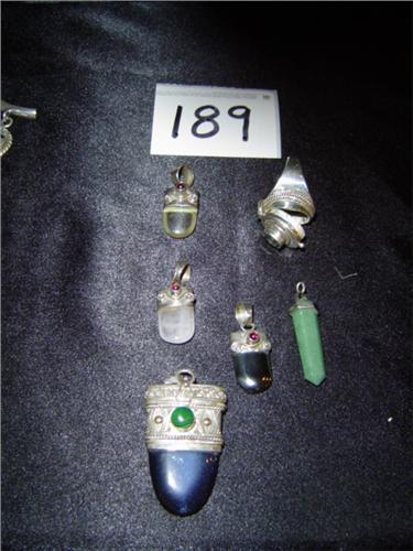Sterling Silver and Semi-precious Jewelry. Three Tongue Point Pendants with Garnet accent stones, .5" X 1", one Clear Quartz, one Rose Quartz and one Hemetite, Green Quartz Cut Crystal 1.5" long, Blue Drop Glass Pocket Pendant with Malachite Accent Stone - 1" X 1.75" and 1 Poisen Ring with Faceted Smokey Quartz Stone.