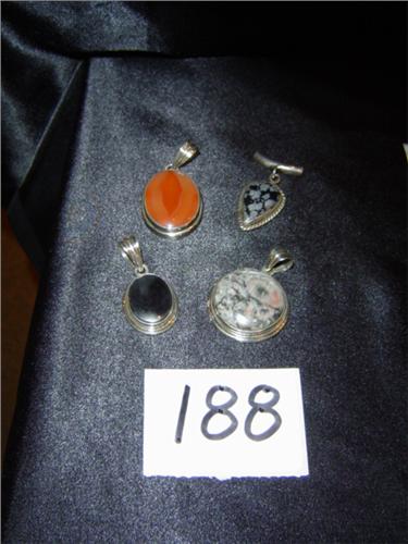 Sterling Silver and Semi-precious Jewelry. Round Black/Pink/Cream Pendant - 1.25", Snowflake Obsidian Pendant - .75" X 1.5", Oval Hemetite Pendant - .88" X 1.25" and Oval Carnelian Pendant - 1" X 1.5"