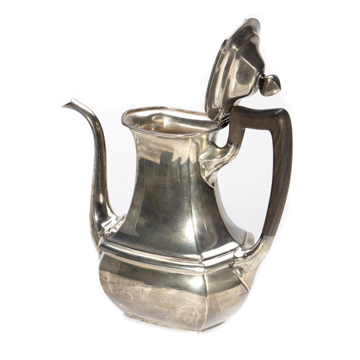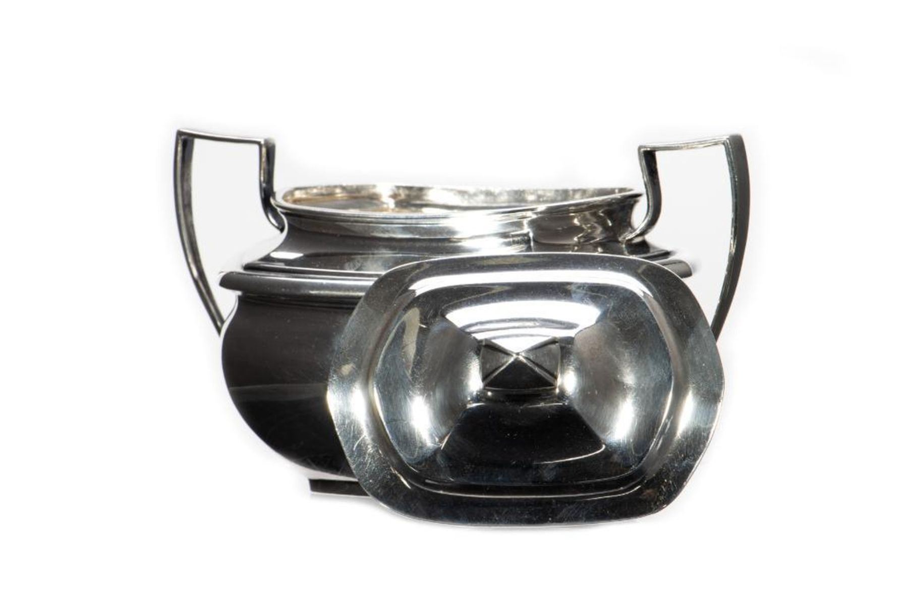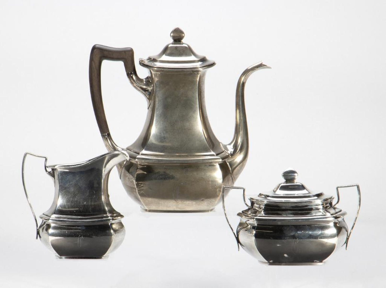 Comprising a teapot, creamer and covered sugar jar. greatest height 9 1/2in. approx. 1183 grams