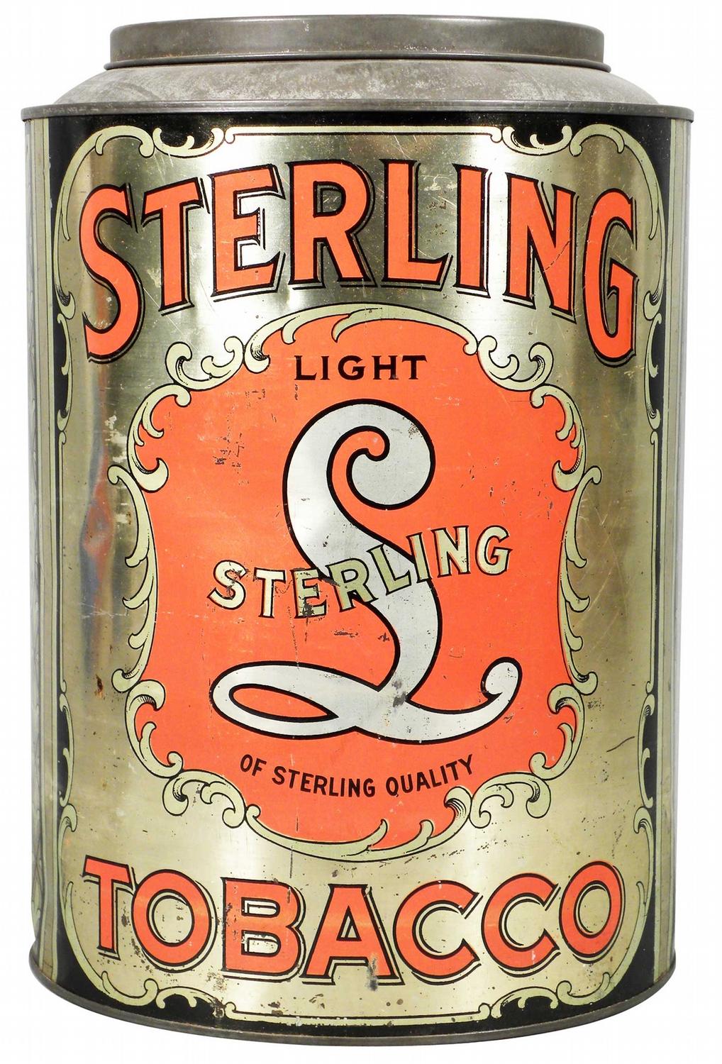 Sterling Tobacco Store Display Tin for Light Fine Cut Tobacco Packages. A few minor dents and scratches otherwise very good condition. 8 1/2 inch diameter X 11 1/2 inches tall.
