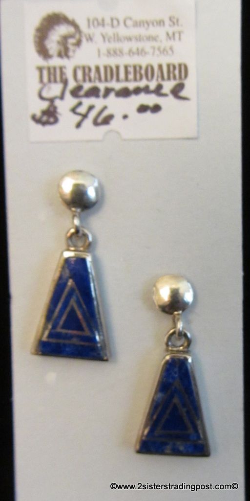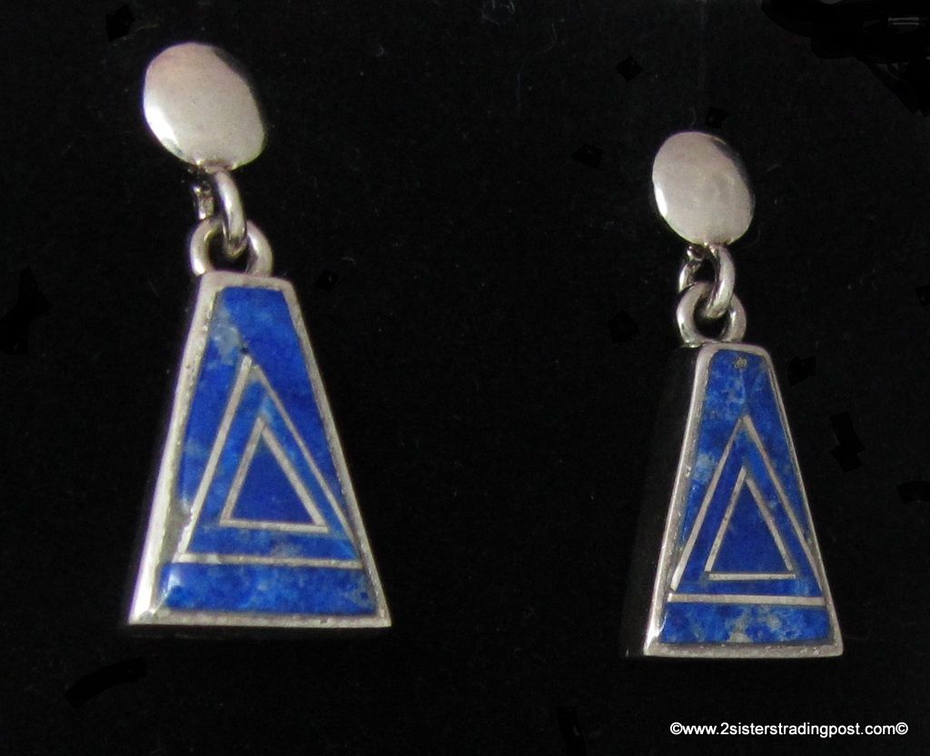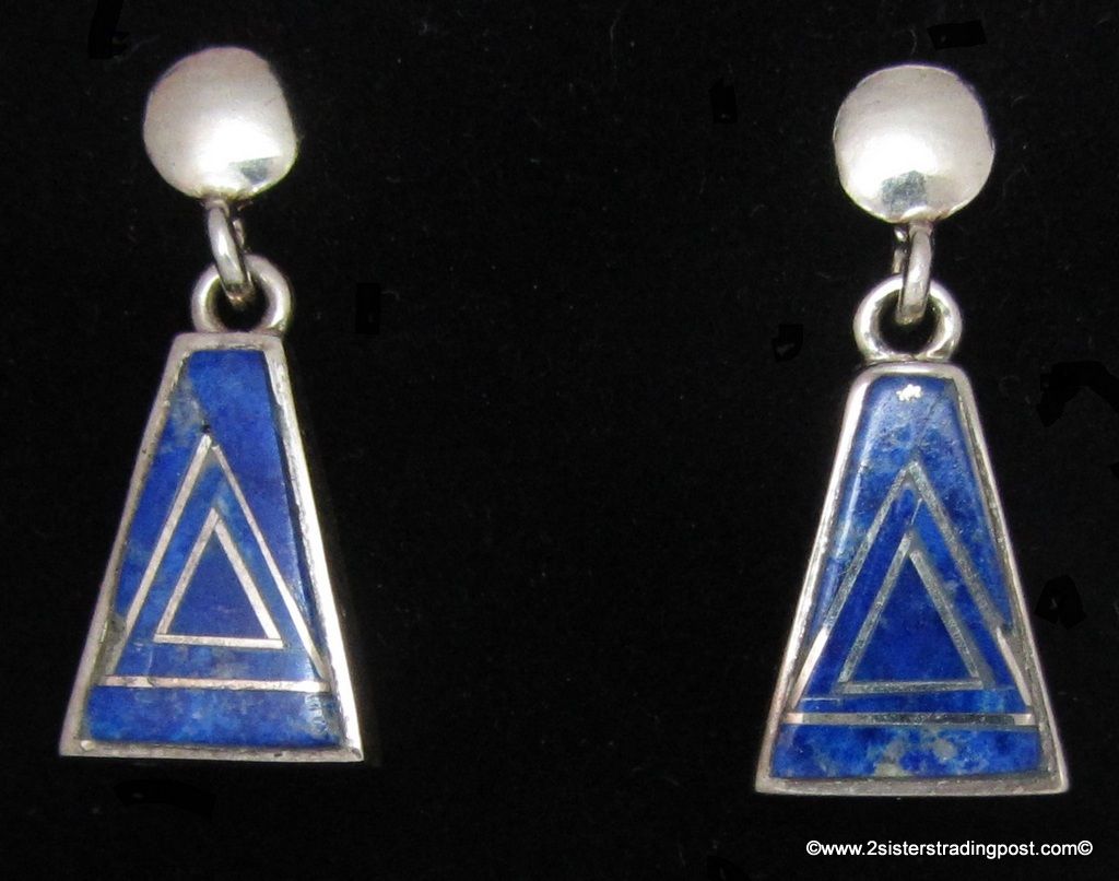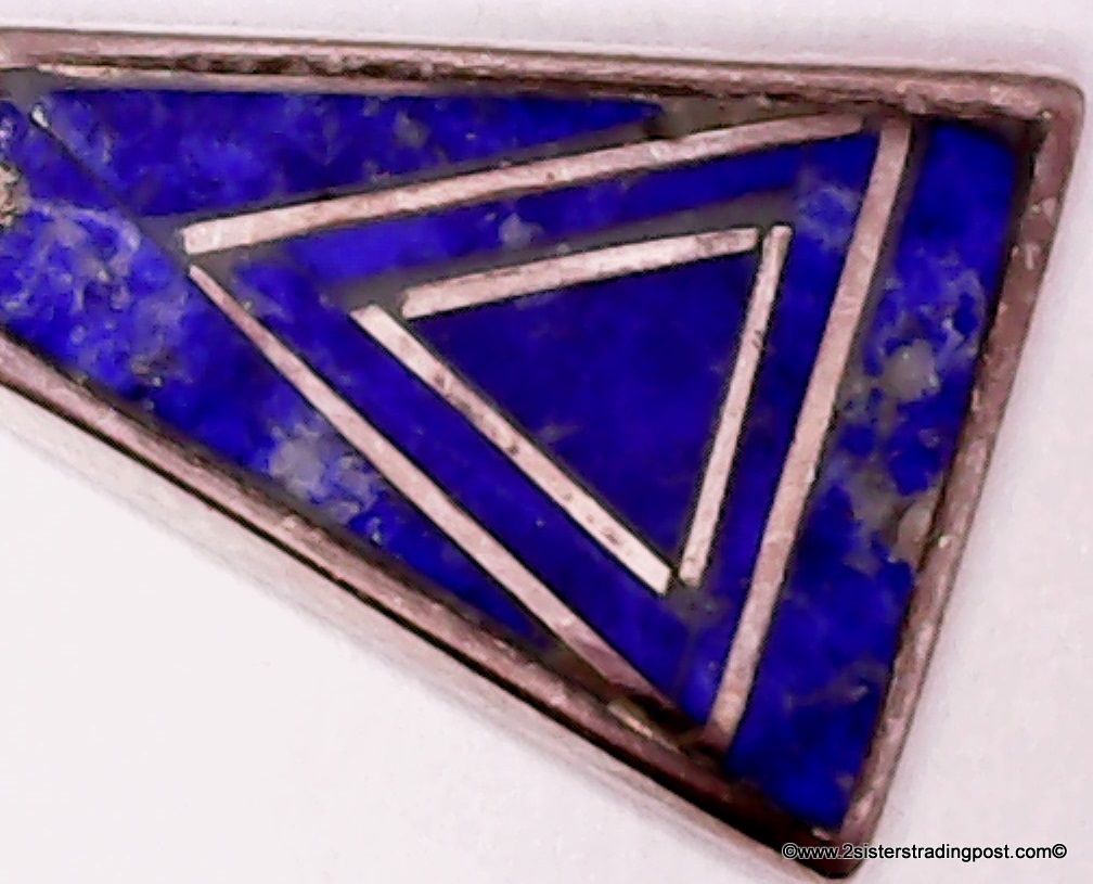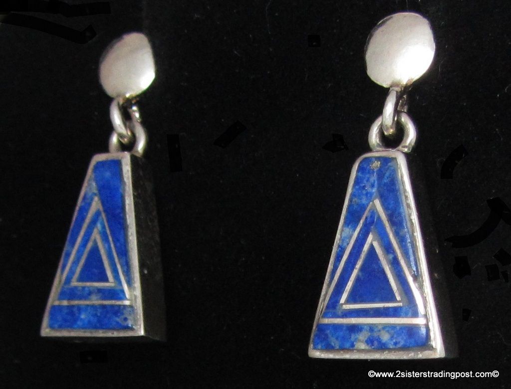 Very simple triangle shaped earrings set in sterling with a triangle matrix of malachite, each matrix of malachite is separated by Sterling to make three individual triangles within the inlay. Earrings measure approximately 13.9 mm long without the bail or post. Top of the triangle measures approximately 4.2 mm wide & the bottom of the triangle measures approximately 10.2 mm wide. Earrings weigh approximately 1.5 g each for a combined weight of 3 g. NOTE: piece is not Hallmarked or stamped with sterling mark, but has been tested and is silver