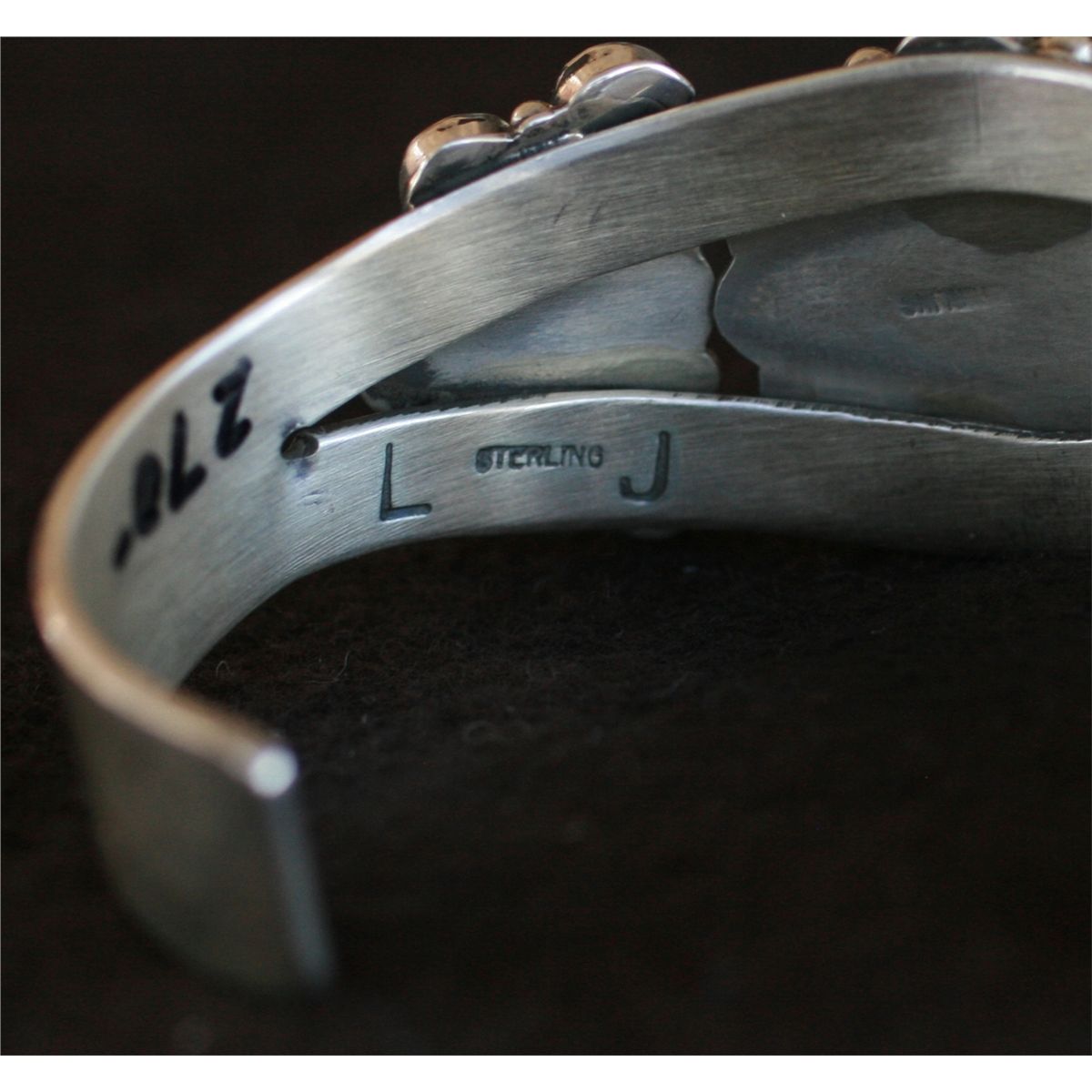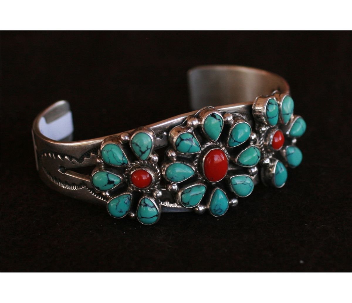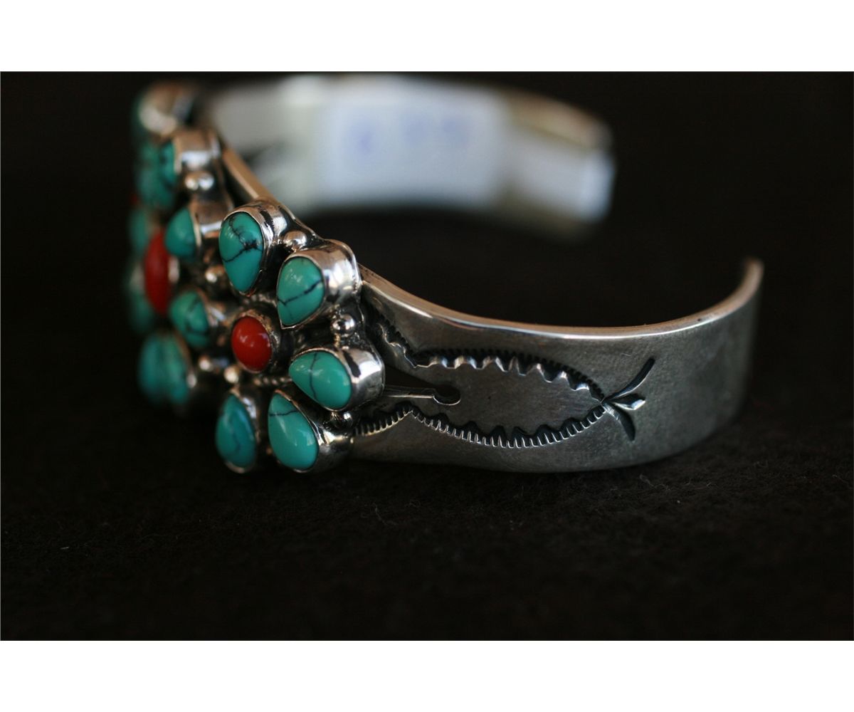 Large heavy sterling silver bracelet with turquoise and red coral flower motif, Signed LJ, 530685 B37