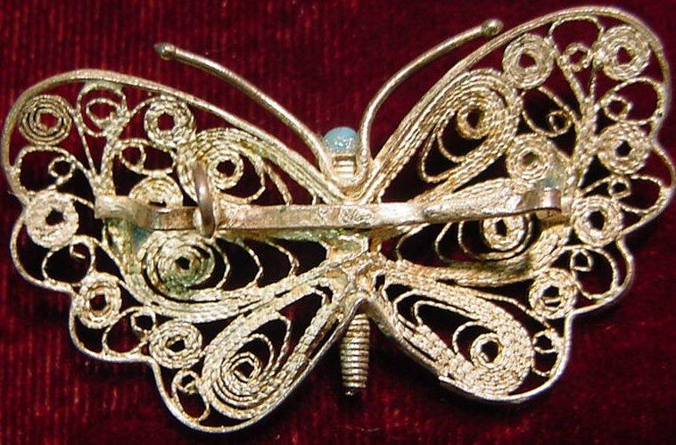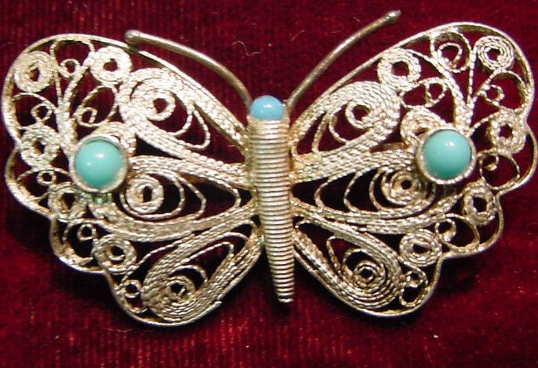 Filigreed Sterling silver Butterfly with Turquoise Sets Pin.