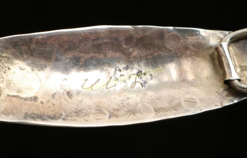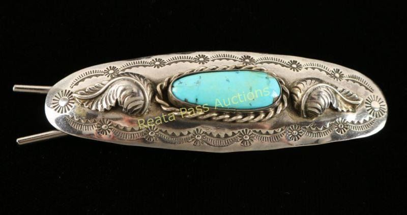 Long oval with center pale blue turquoise stone surrounded by a rope design with a feather on each side. Etched with lovely scallops on the outer edge. Marked 'LM'