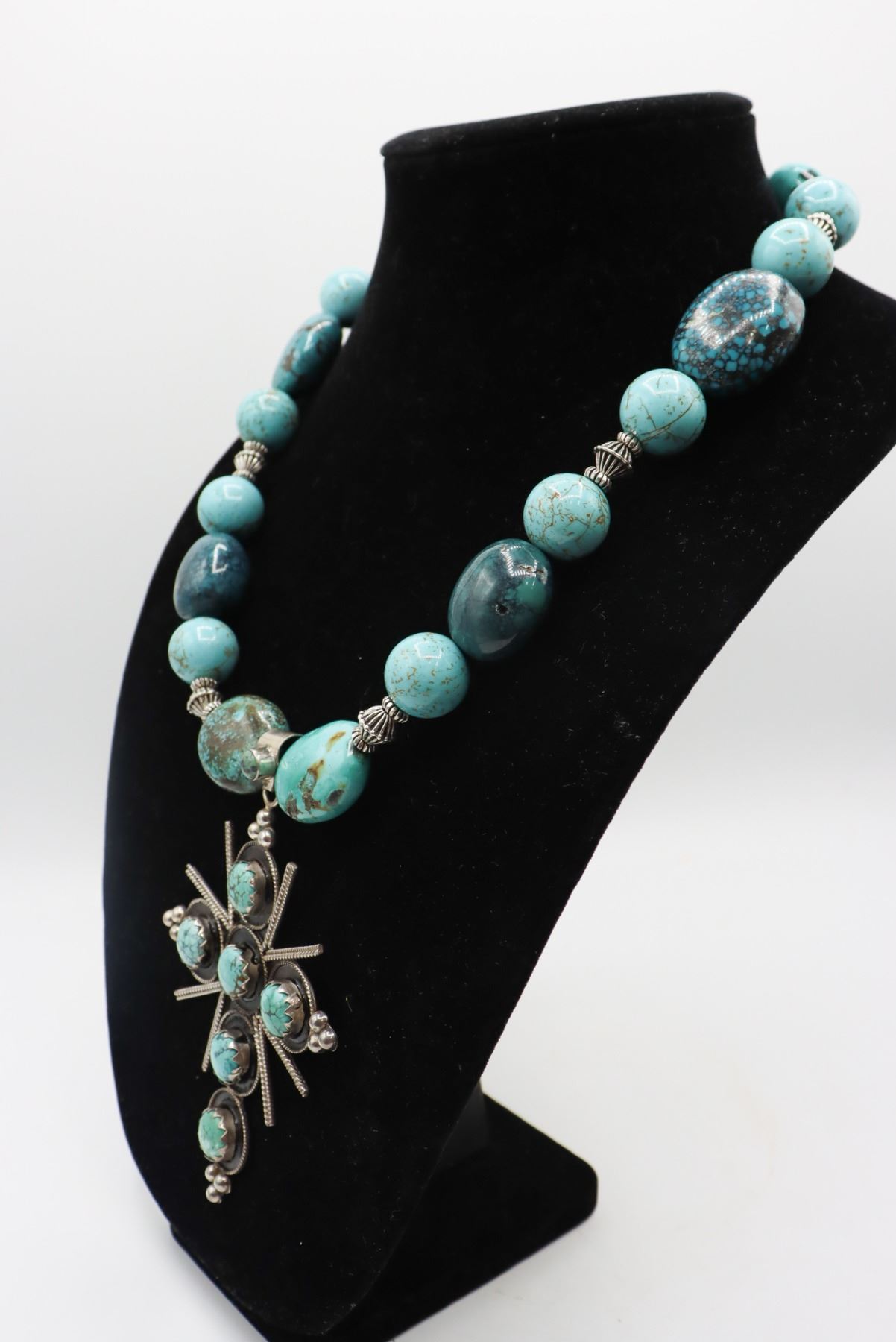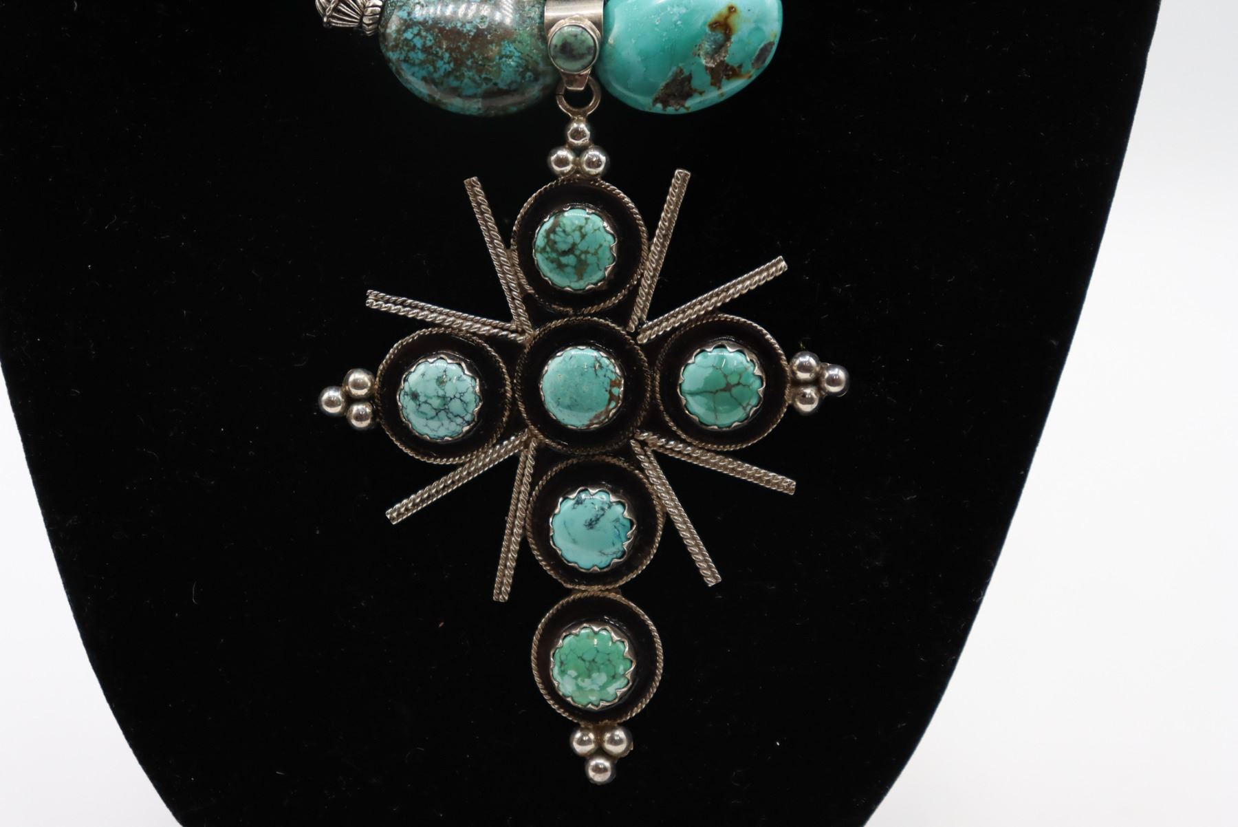 Large cross pendant with silver and turquoise design.