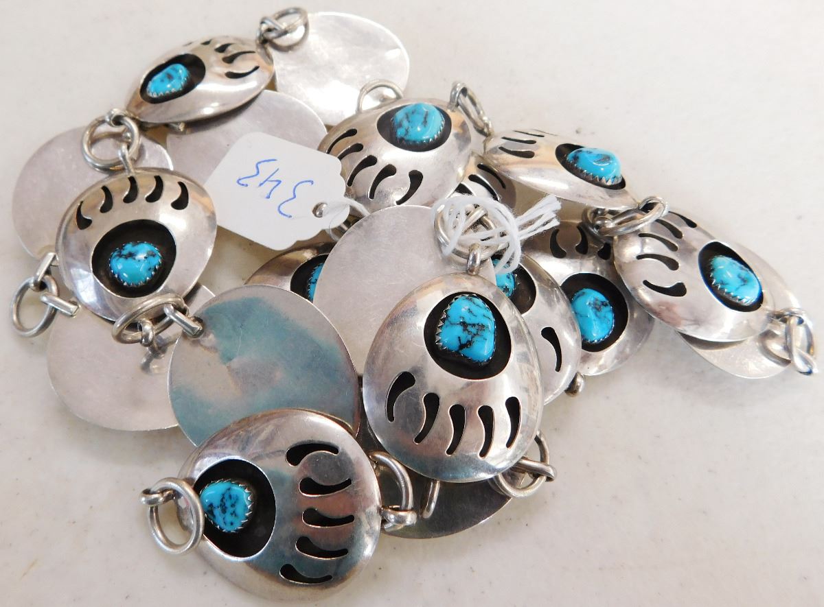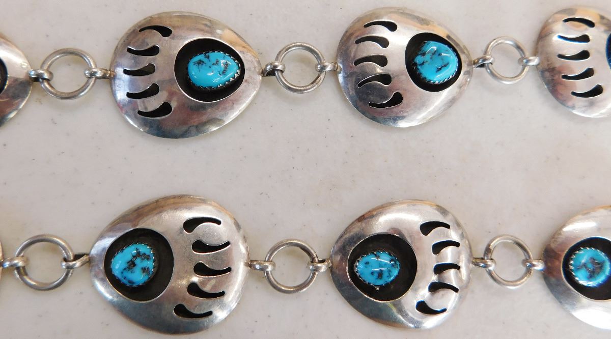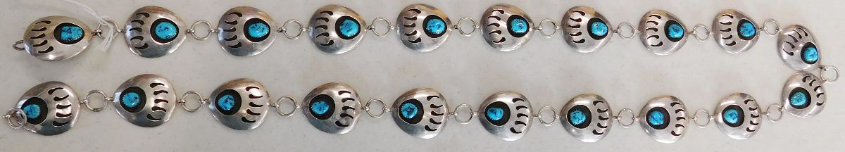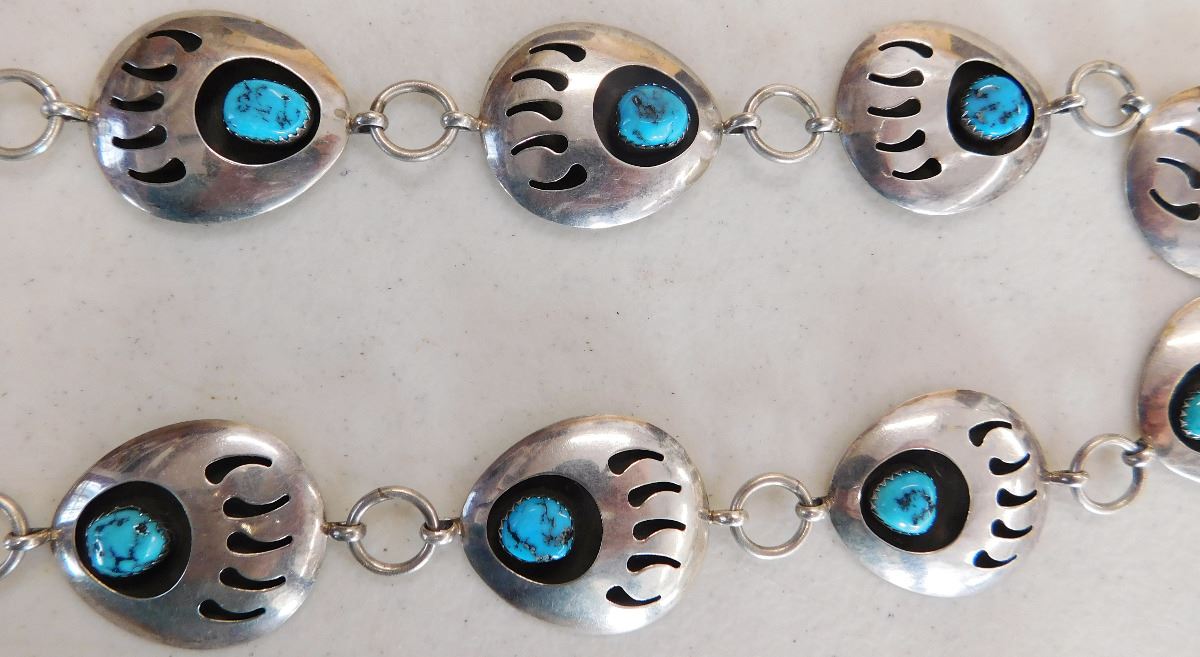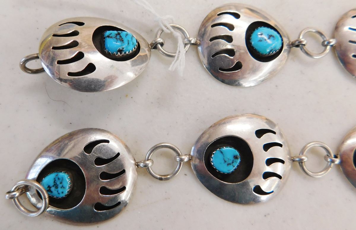 Sterling & Turquoise Concho Belt, circa 1960s. Made of sterling silver and turquoise stone, the item has 20 conchos measuring approx. 38" in length. Each concho is about 1.25" x 1". Total lot weight is 94.5 grams. Nice bear claw design concho belt. Navajo. Condition: Good, see images. Shipping: $17.50 w/insurance and signature.