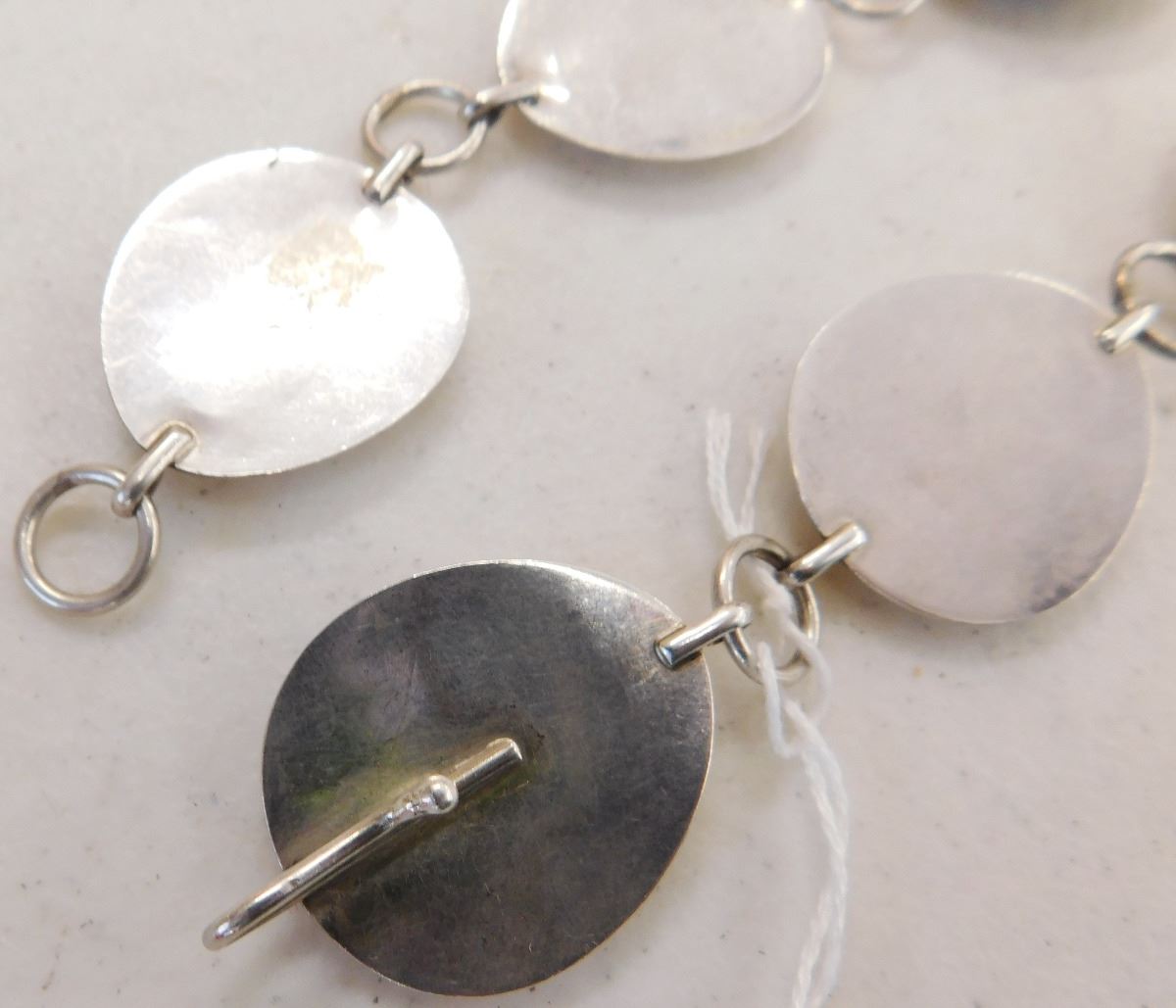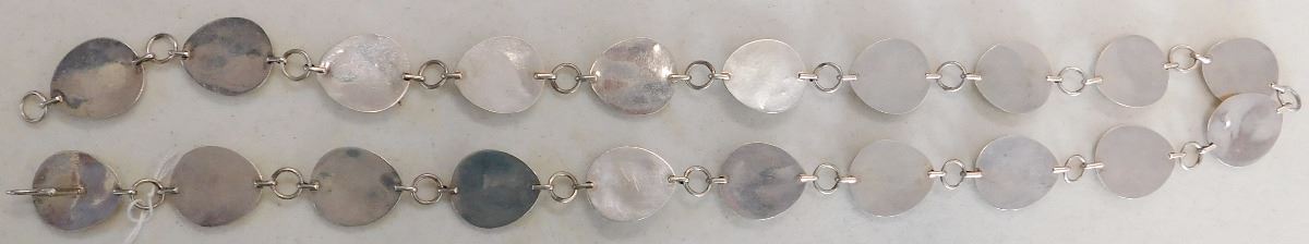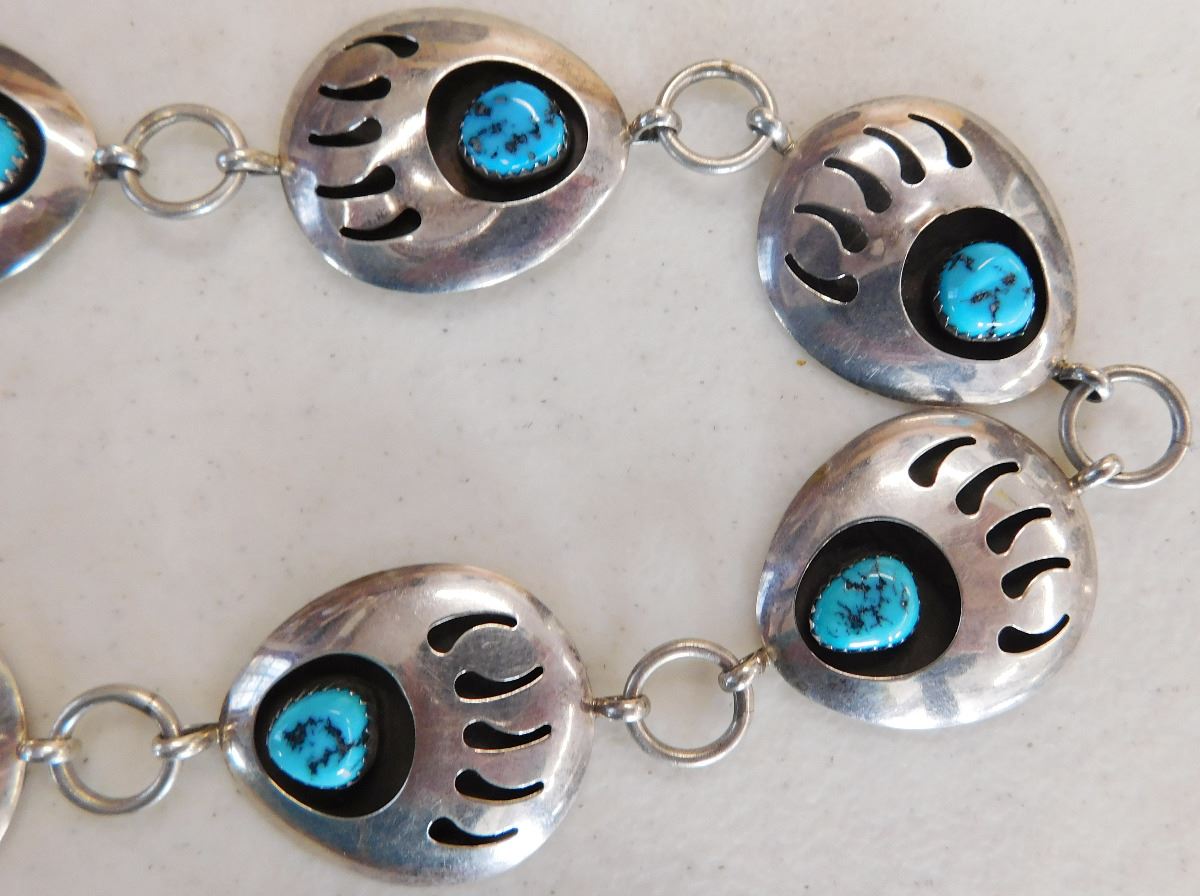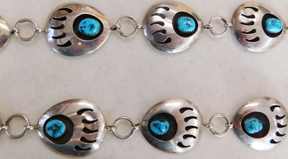 Sterling & Turquoise Concho Belt, circa 1960s. Made of sterling silver and turquoise stone, the item has 20 conchos measuring approx. 38" in length. Each concho is about 1.25" x 1". Total lot weight is 94.5 grams. Nice bear claw design concho belt. Navajo. Condition: Good, see images. Shipping: $17.50 w/insurance and signature.