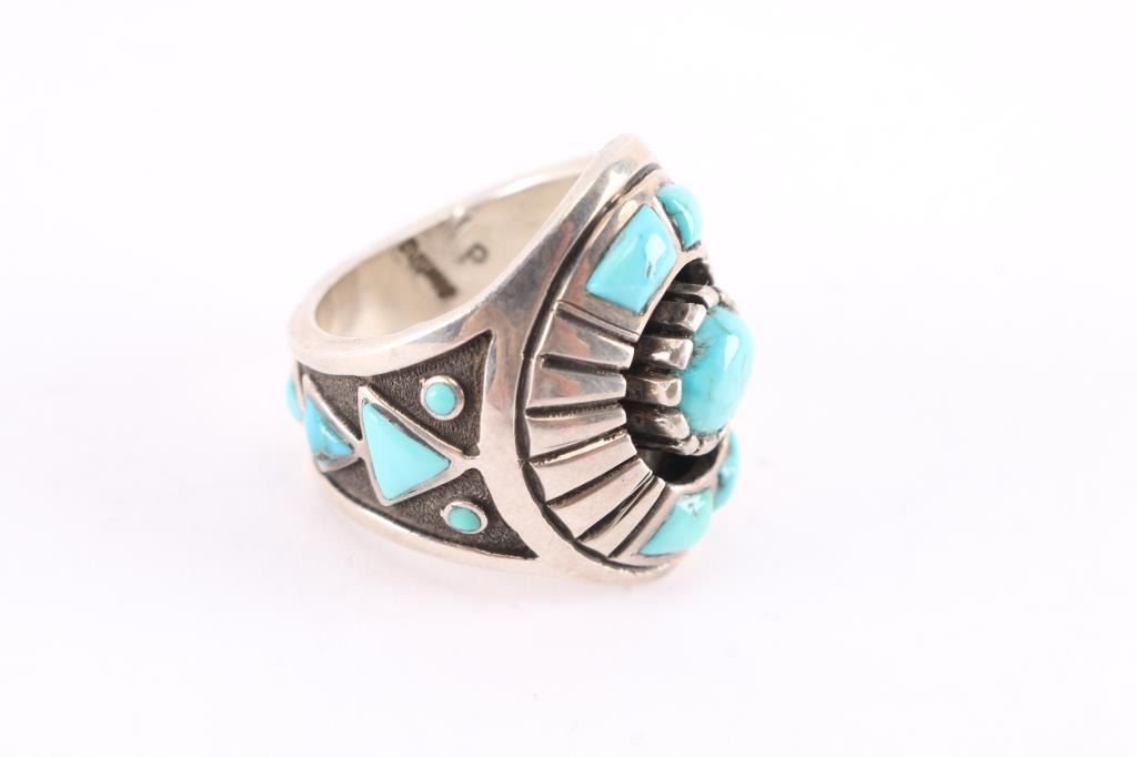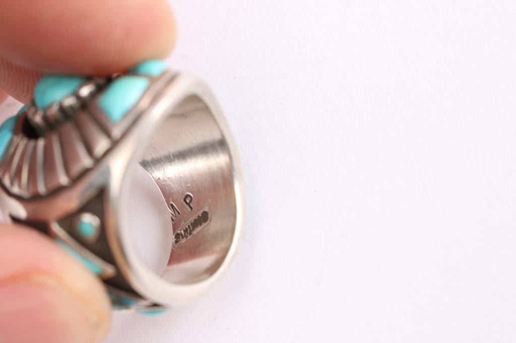 Maker marked MP. Size 9. Turquoise round stone in center with four square turquoise stones set in chiseled sterling silver design. Each side has a design with 9 additional stones in the designs.