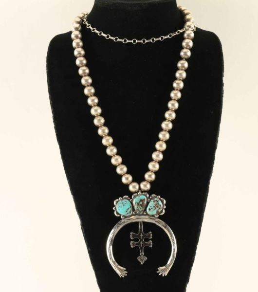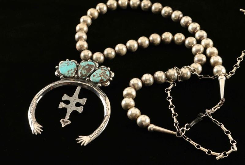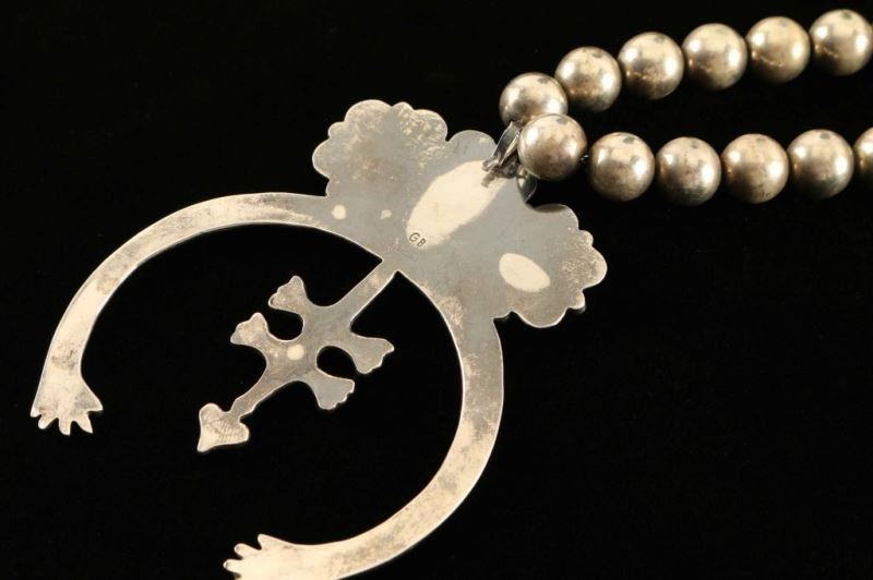 Polished silver Navajo pearls hold three ovals of Bisbee turquoise that are part of a sterling hands with heart and cross design naja. Marked 'GB' and 'Sterling'. Comes on adjustable chain with hook and eye closure, 16" long approx.. Very nice.
