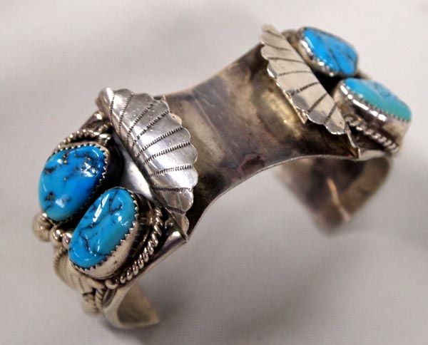 Sterling Turquoise Watch Bracelet - TK Emerson. Beautiful sterling work with 4 large turquoise cabochons. Bracelet measures including the opening approx. 6 3/4'' x 1 1/4''W.