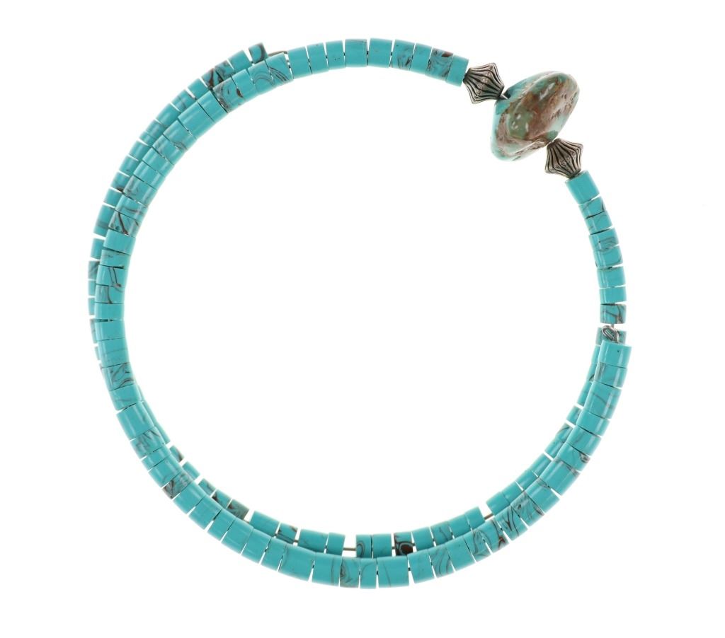 Offered in this lot are a Sterling Turquoise Watchband and a Turquoise Choker. The Sterling elastic watchband features four (4) beautiful bezel set Sleeping Beauty turquoise cabochons in floral sterling designs. The Cripple Creek Turquoise choker featured a central large Cripple Creek cabochon with Fox turquoise Heishi beads and silver hogan beads. The watchband has "sterling" stamped on the reverse. The choker measures 5" in diameter, the watchband is 2.25" diameter without a watch. Total weight 26.1 gms.
