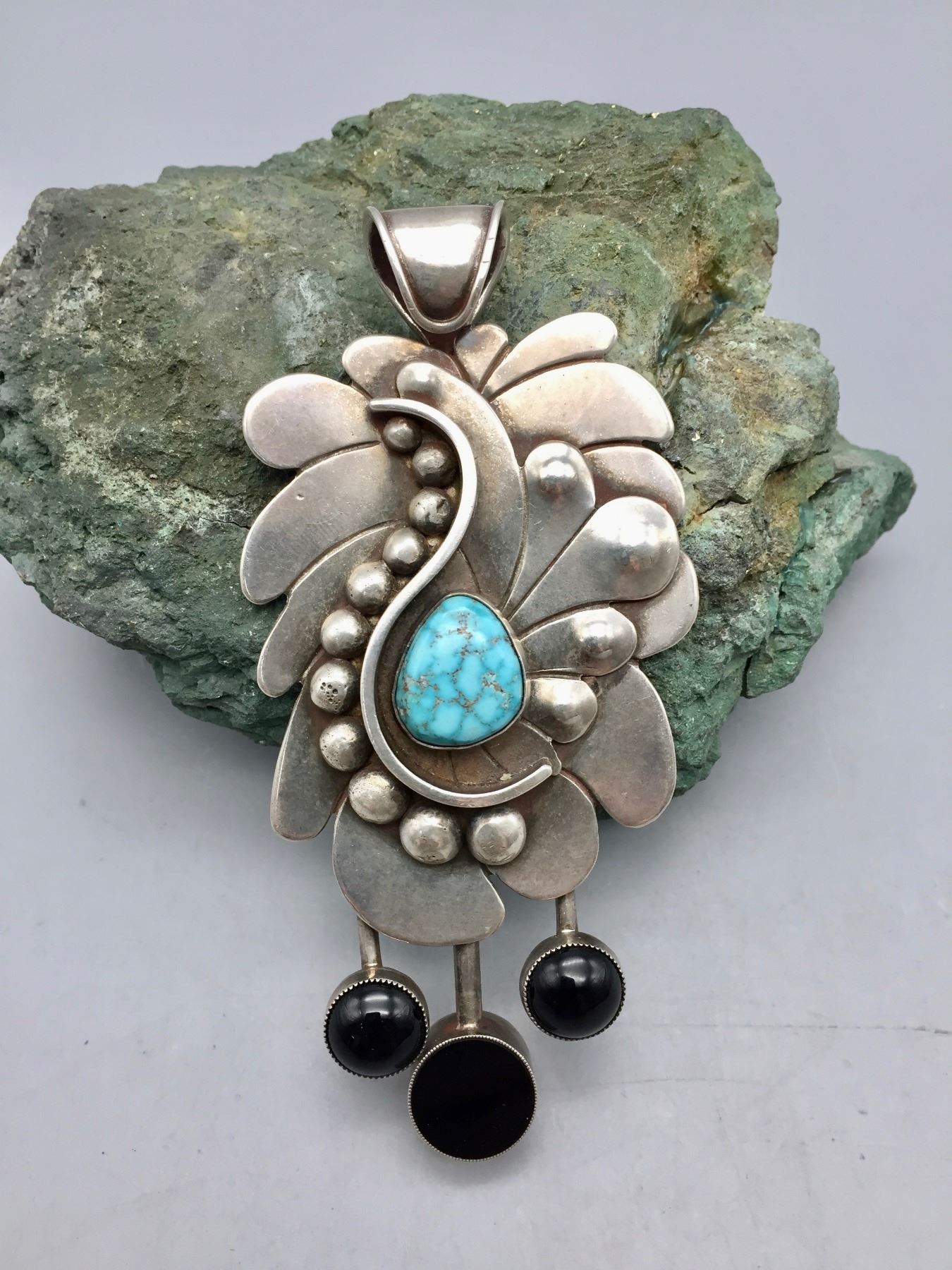 Description: For your consideration, this lot features a beautiful and unique sterling silver pendant with a single, high grade, turquoise stone with a coppery looking matrix and three black onyx stones. This is very modernistic looking pendant by a known artist. It was tested as sterling silver. Maker: Hallmarked RSJC for Richard Casey (an award winning Creek artist). Approx. Age: Size: Measures 2-1/4”w x 4-1/2” tall. Weighs 102.1 grams. Condition: Good for its age, normal wear expected. Please look closely at the pictures - they are an important part of our description. Shipping: There will be a $5 handling / packaging fee for shipping this lot. The actual cost of postage will be added on top of that.
