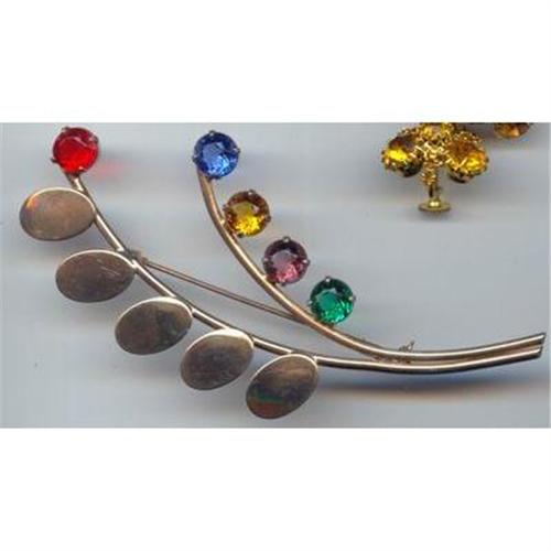 This striking design is sterling silver with a gold overlay in an almost sparse design. It is accented with jeweltone round rhinestones. The 4 inch heighth makes this a formidable piece. It has a locking safety clasp on the back and is marked, STERLING.