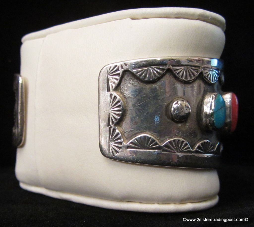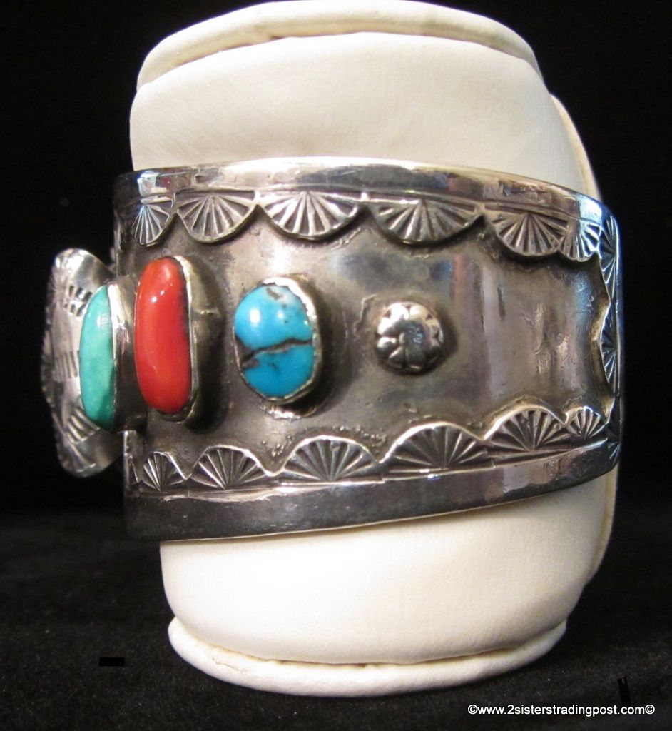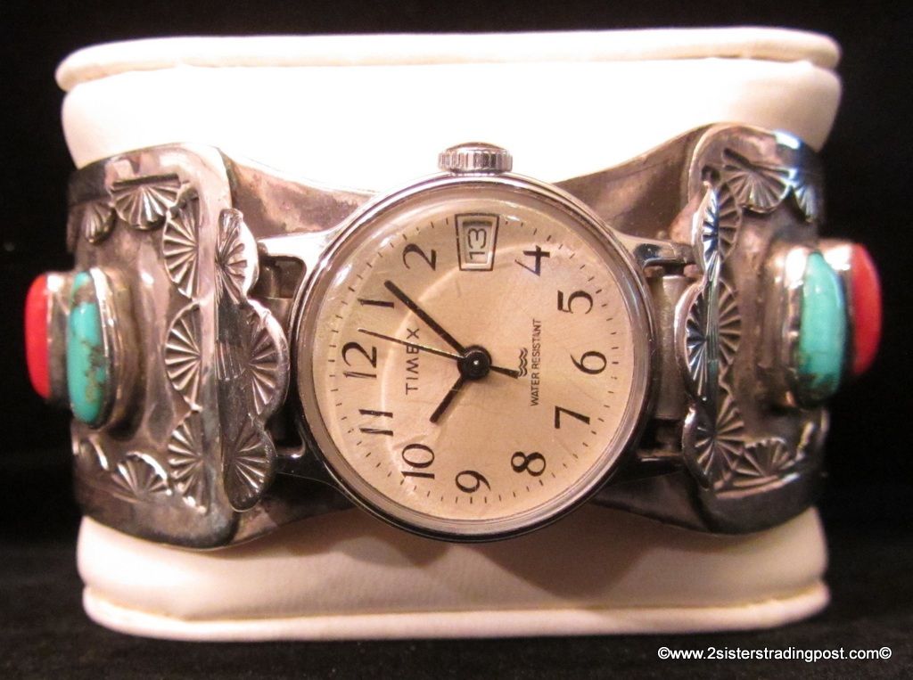 Sterling silver watch cuff with Timex timepiece looks Navajo. Cuff has 6-4 turquoise and 2 coral, stones 3 on each side. Cuff measures 30.8 mm at widest point and 22 mm at cuff opening. Inside cuff circumference measurements are 2 1/2" x 1 3/4" with 1 1/8" opening. Cuff weighs 71.9 g. Piece is not stamped or signed NOTE: Watch has new battery and is running