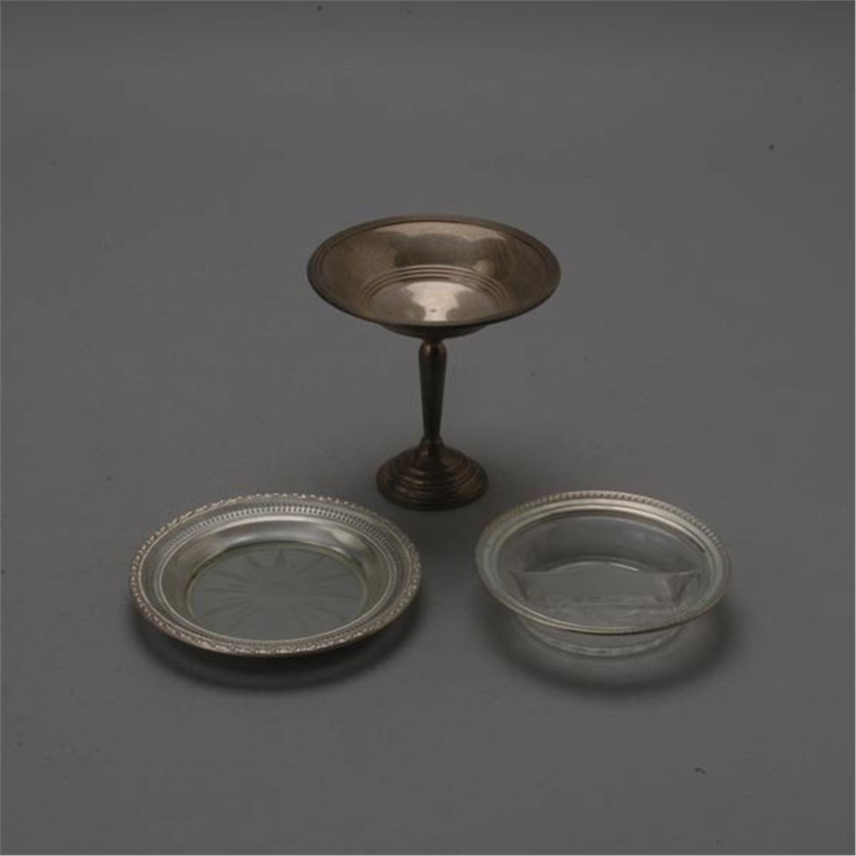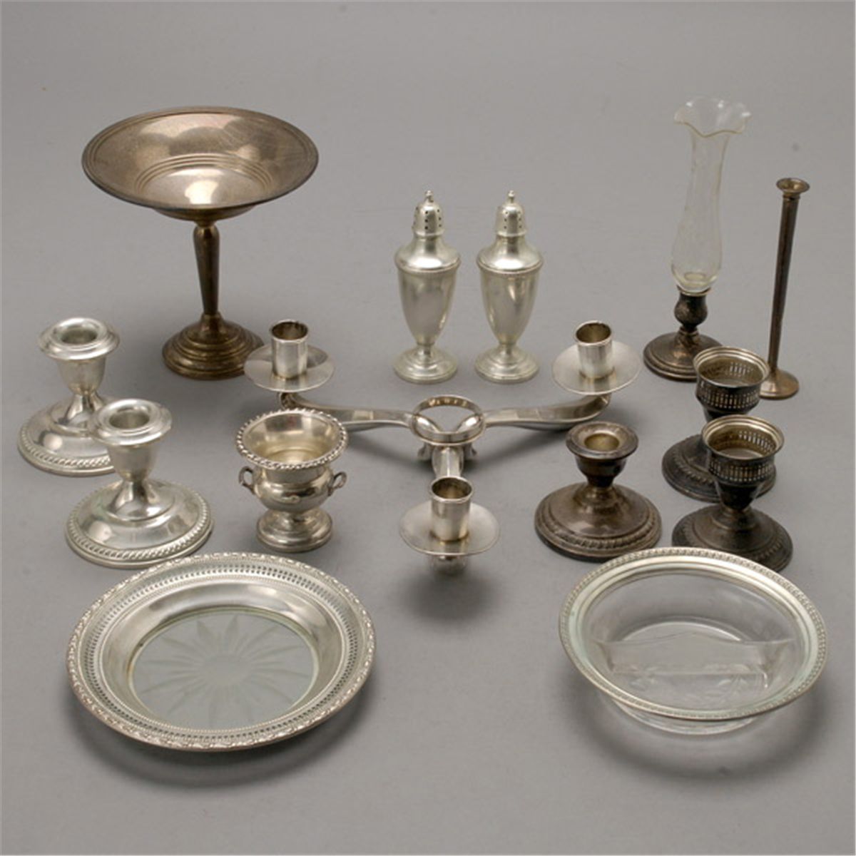 Sterling Weighted Group: five candlesticks; two bud vases; a Revere miniature urn; a Preisner compote; two silver mounted glass bowls; a pair Fisher shakers; together with a Fisher three light candelabra insert (14) {Total weighable silver 5.60 troy oz; height of compote 6 inches}