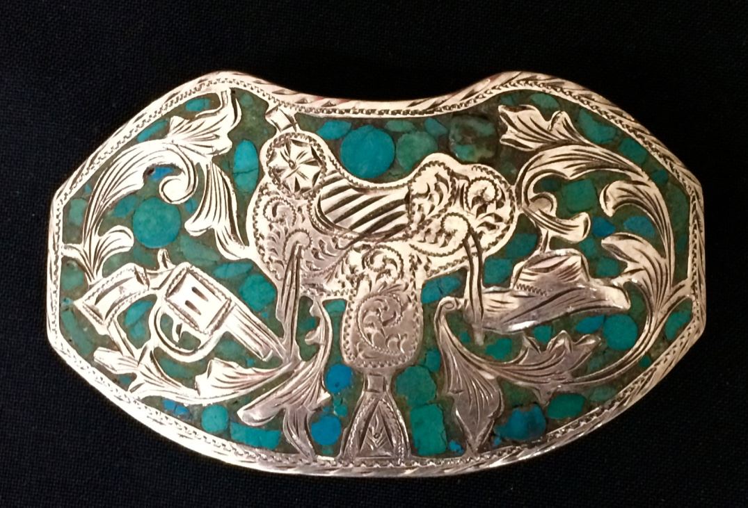 This sterling belt buckle is 2” X 3.5” and will fit a belt up to 1.5” wide. Beautiful turquoise inlay work with a silver saddle etching. Stamped .925 and a Mexican hallmark. Weighs 49.2g