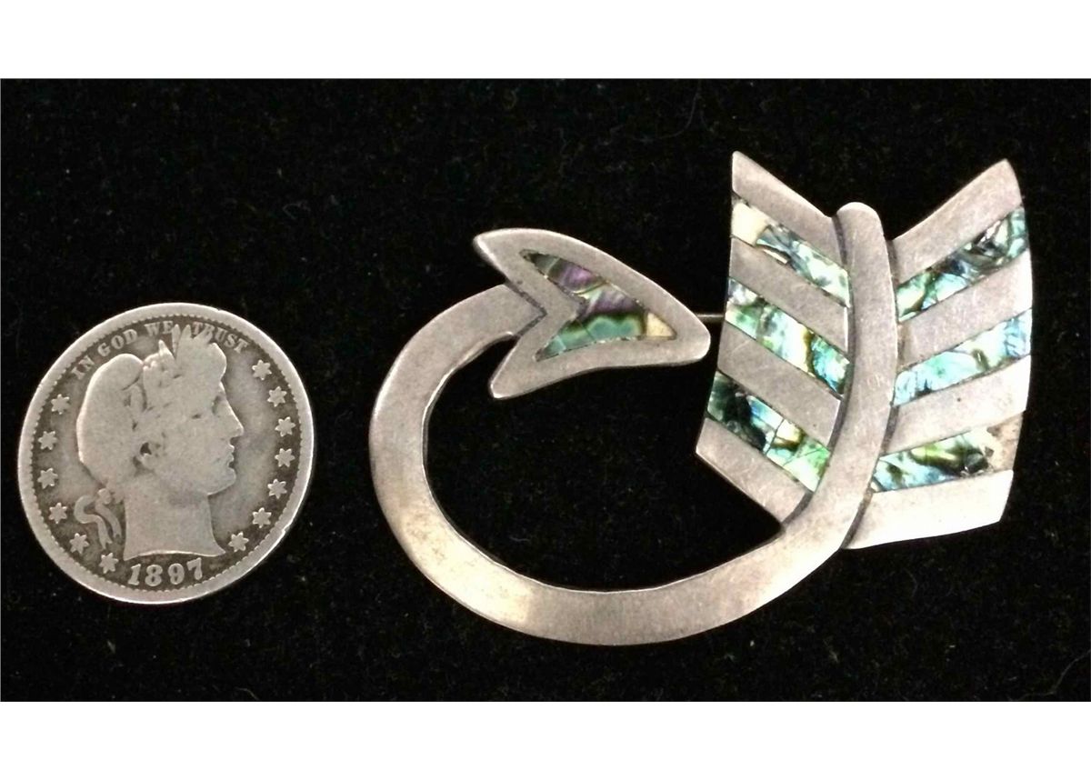 This nice sterling silver and abalone shell pan is from Taxco, Mexico, and is hallmarked as such. Weighs approximately 8.7 g.