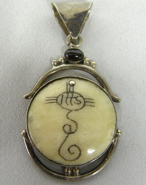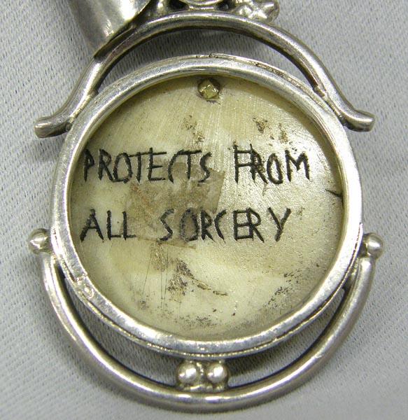 Sterling and Bone Rune Pendant, reverse side reads: Protects From All Sorcery, measures 2.75'' x 1.5''. Buyers Pay Actual Shipping and Handling Charges(see terms and conditions for more information).