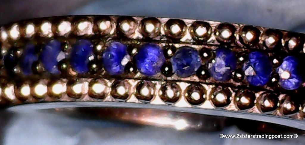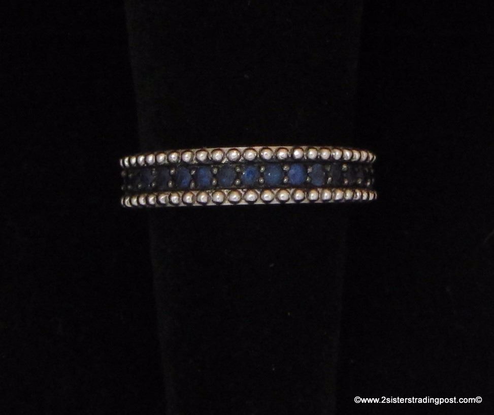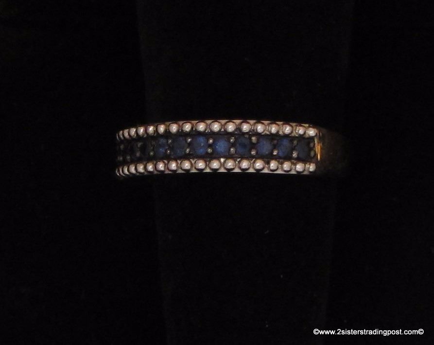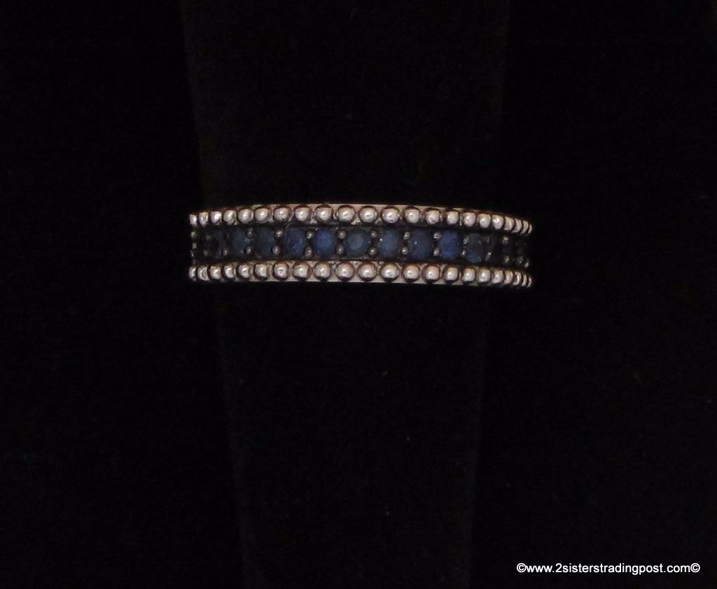 Size 6-6.25 dark blue topaz channel set ring has 15 stones each approximately .01 carats for a tcw of 0.15 set into a 4.8 mm wide sterling band. Ring weighs 3.9 grams is stamped J and .925 on one interior side of the band and China on the other