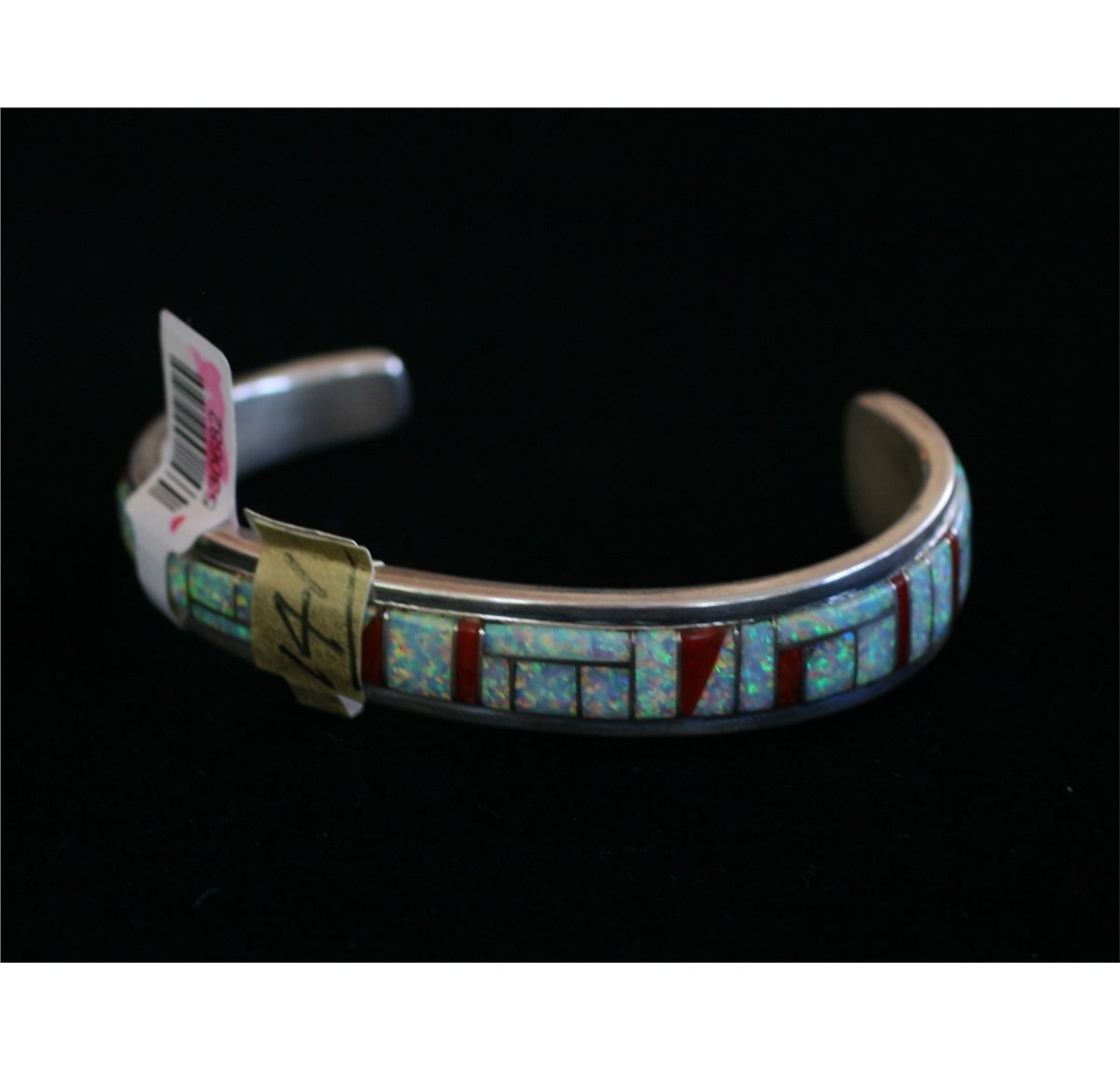 Heavy Zuni sterling silver bracelet with inlaid opal and red coral, 530682 B58