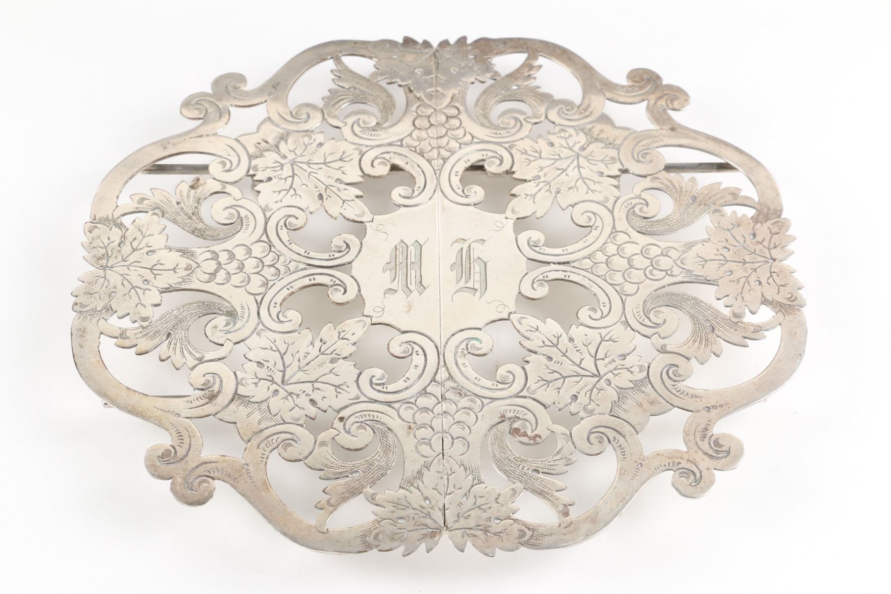 Lot 282 - English and French. Three (3) pieces. 1805 London sterling marrow scoop (52g). Post 1838 French (Paris, "J.D. .950") sterling paw-footed sugar tongs marked 'J D' (42g). One plated plate rest. Box 21" x 9" x 5". $175-250.