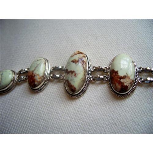 Offered here is a stunning bracelet of turquoise stones set in sterling silver. The stones are oval, the two end stones are teardrop shaped. They are cabuchon set with rope twist edging. The turquoise is a pale aqua with a dark chocolate brown matrix and it is both unusual and quite beautiful. The bracelet is an adjustable length, such that it can be hooked into one of three round silver links at the end. The larges stone is 1.25", the smallest is 1". The length is 9", and that is measured out to the last link.