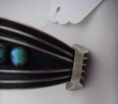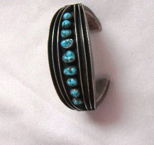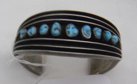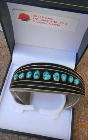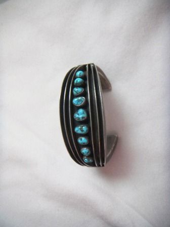 Old Pawn Sterling and Turquoise Bracelet. The opening is one and five eighths, The Bracelet is about seven inches by one inch. There are nine nicely matched turquoise stones. Shipping $16.00