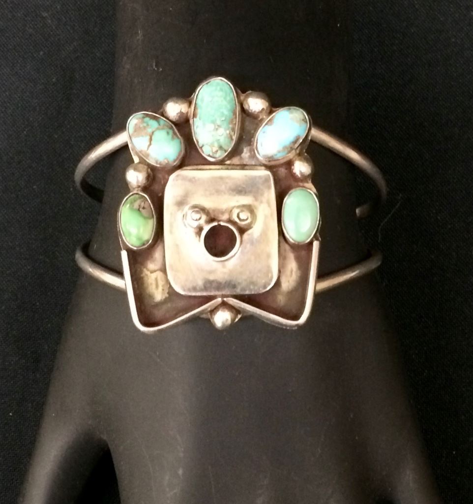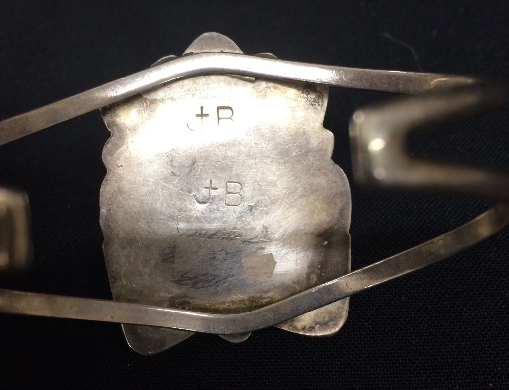 This sterling and turquoise cuff bracelet was tested as sterling silver and has a JB hallmark in it. It measures 5” inside circumference plus there is a 1” opening. It is 1.75” at the widest point and weighs 25.2g