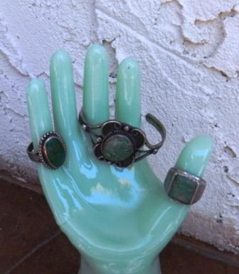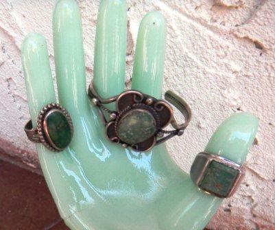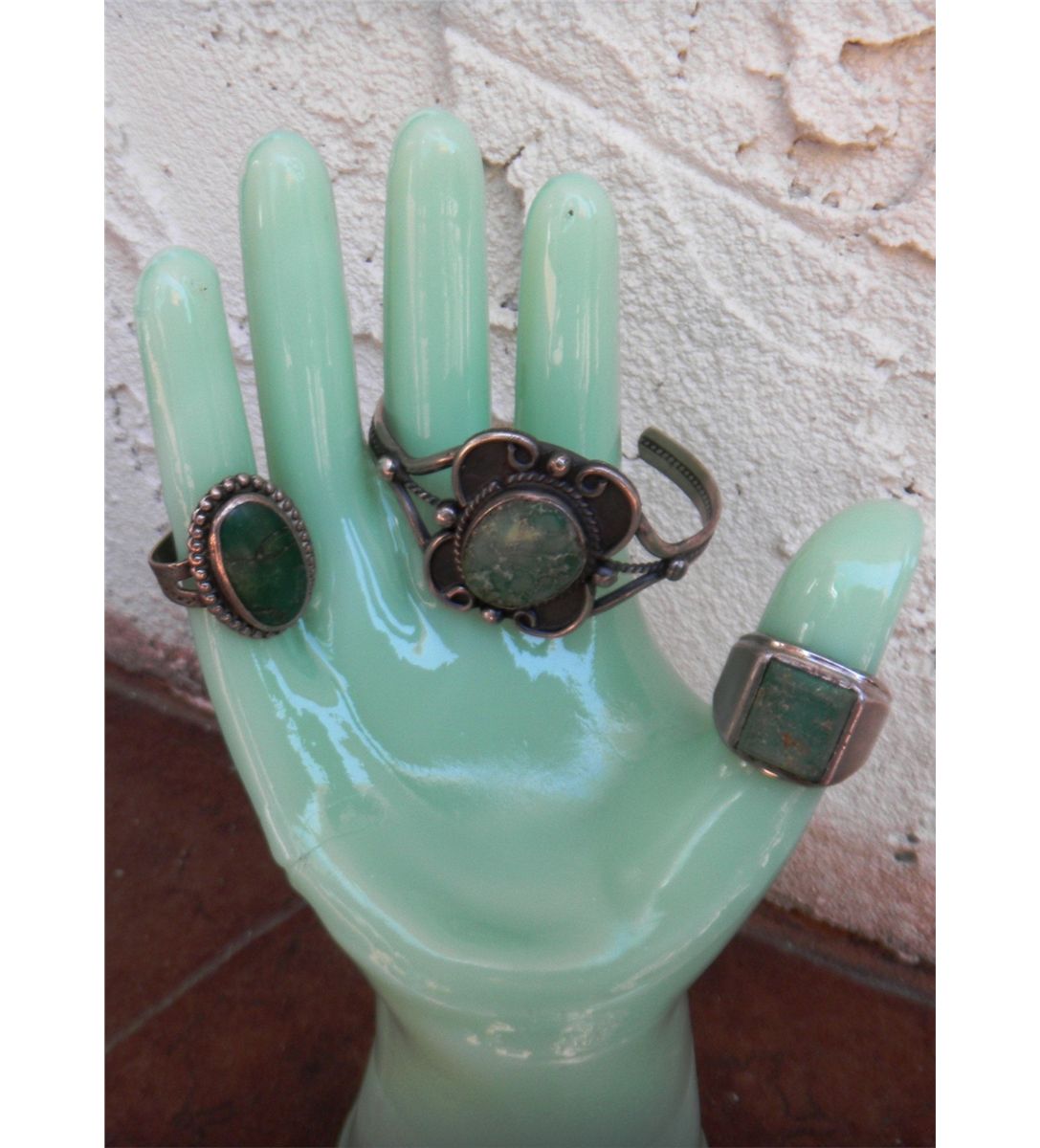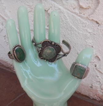 Two sterling rings and one sterling bracelet, each with nice green turquoise stones. The bracelet measures approximately 1 1/4 at the opening. The items are not marked. Good condition. Shipping $15.00