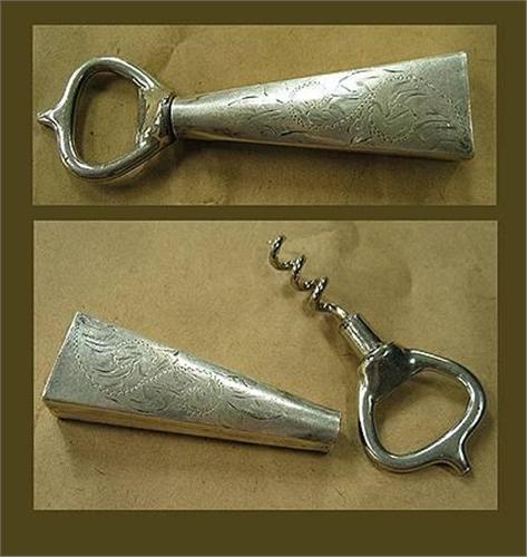 Sterling clad cork screw and bottle opener. The corkscrew fits into the clad handle. No monograms, marked "Sterling"