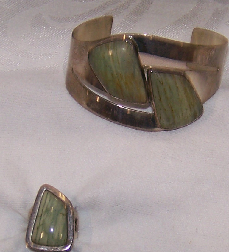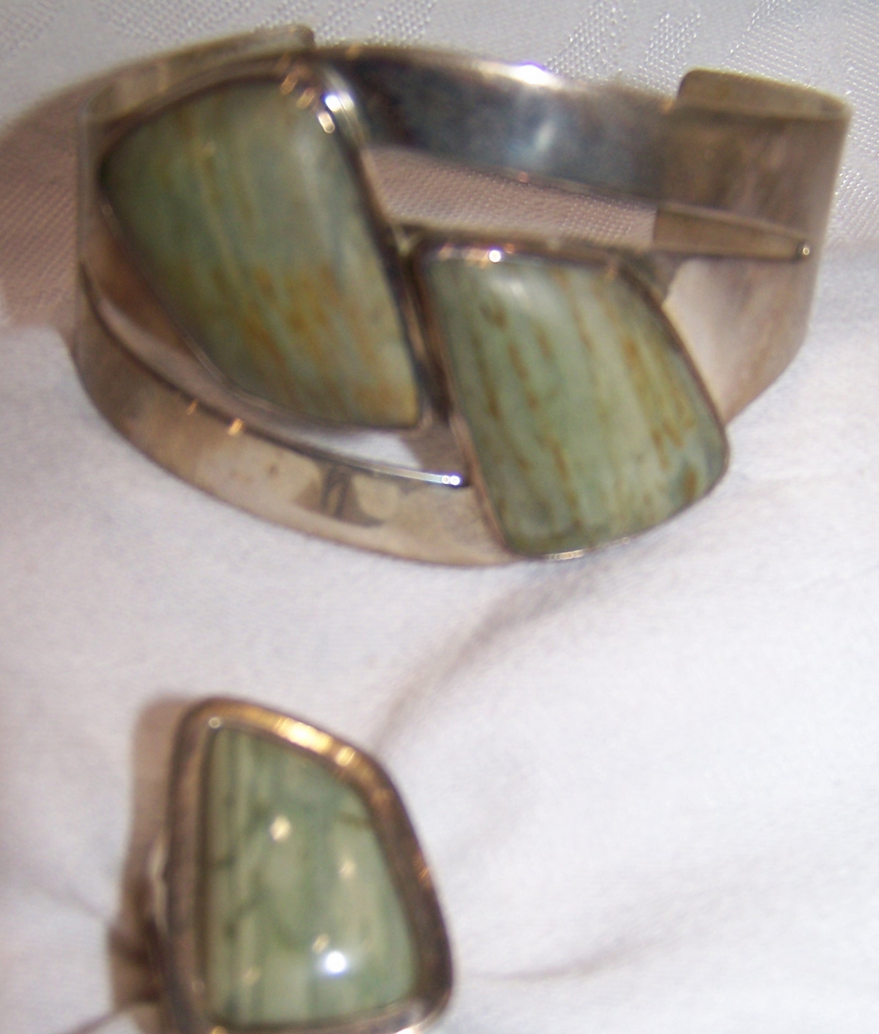 A sterling silver cuff bracelet 7 matching ring set w/ green jasper. The bracelet & ring weigh 67.5 Grams