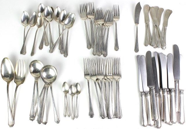 having belonged to Molly Frawley's mother, Agnes Ryan Bolster. Includes 10 forks, 10 spoons, 10 salad forks, 10 knives, 1 spoon and fork server set, 8 butter knives, 6 soup spoons, and 4 small dessert spoons. All are monogrammed ARB. Est. 400-800