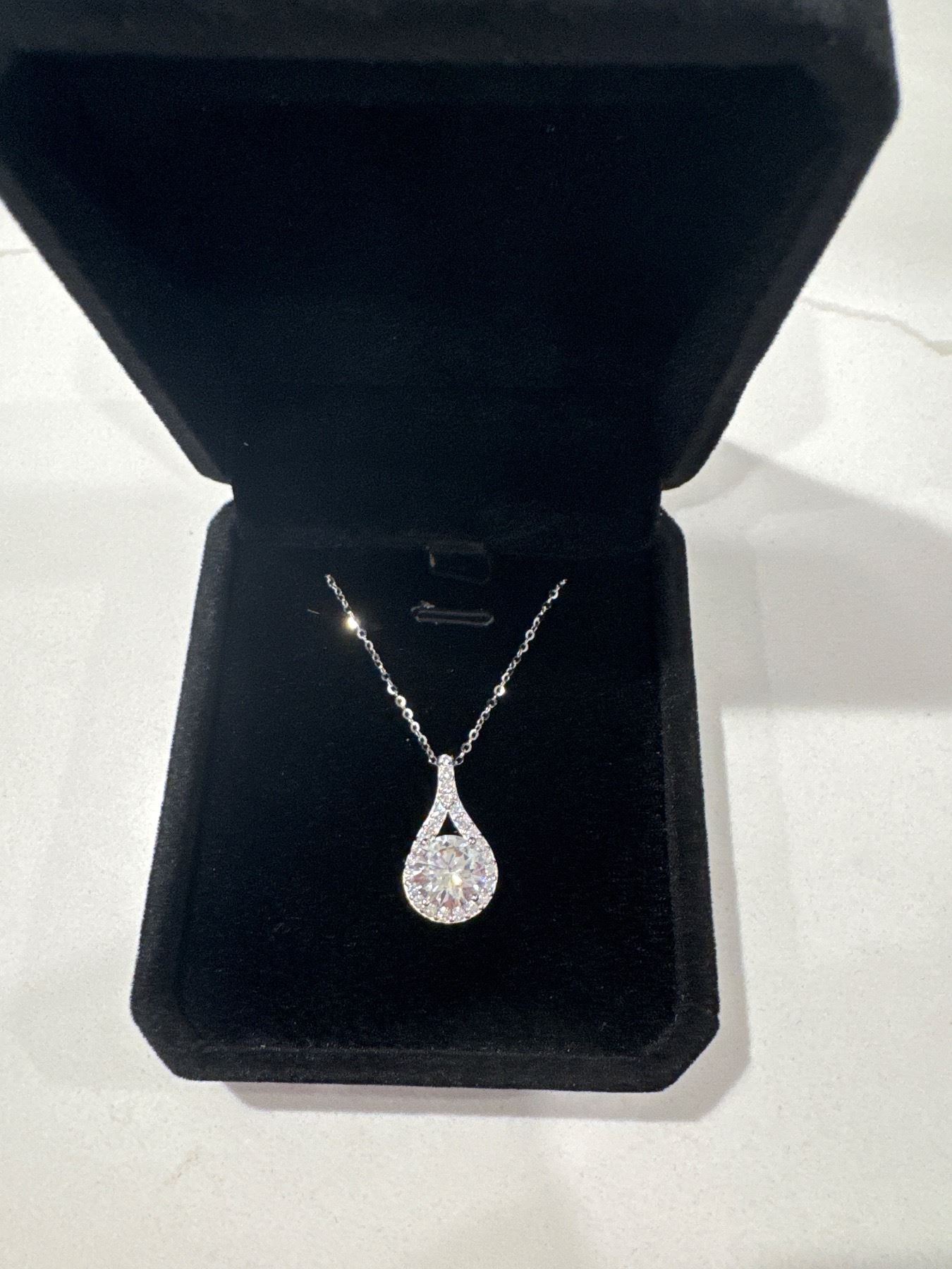 Sterling silver 3CT simulated diamond round brilliant cut pear halo necklace adjustable chain 16" to 18" mounted in 925 sterling silver with white gold overlay