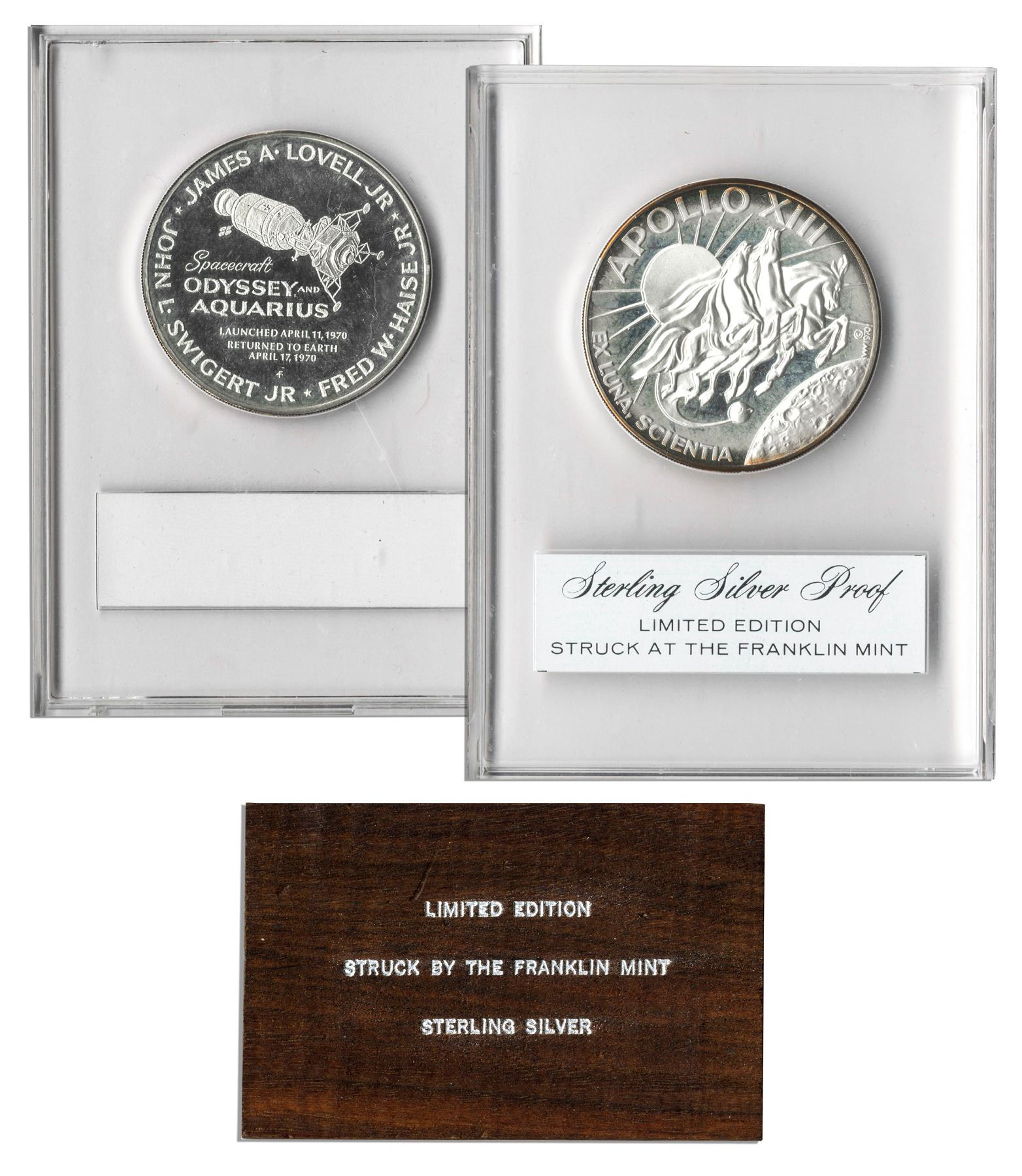 Sterling silver Apollo 13 medallion owned by Jack Swigert. Limited edition medal issued by the Franklin Mint features the mission insignia to obverse: a trio of horses galloping over the moon. Reverse features depictions of the Odyssey and Aquarius modules, along with the dates of the launch and early return. Proof medal measures 1.5'' and is encapsulated to an overall size of 2.75'' x 3.75''. Accompanied by a wooden stand with silver print on the underside indicating limited edition and sterling. Discoloration to rim of medal, else near fine. With an LOA from the Swigert estate.
