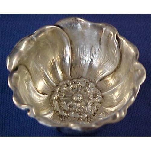 This is a lovely sterling silver salt cellar in the shape of a single poppy flower. The details are realistic and magnificent! This piece measures 1.75" across and 1" tall and is in excellent condition. It is marked sterling and has the W and crescent mark for Watrous. Shipping to US addresses is $4.