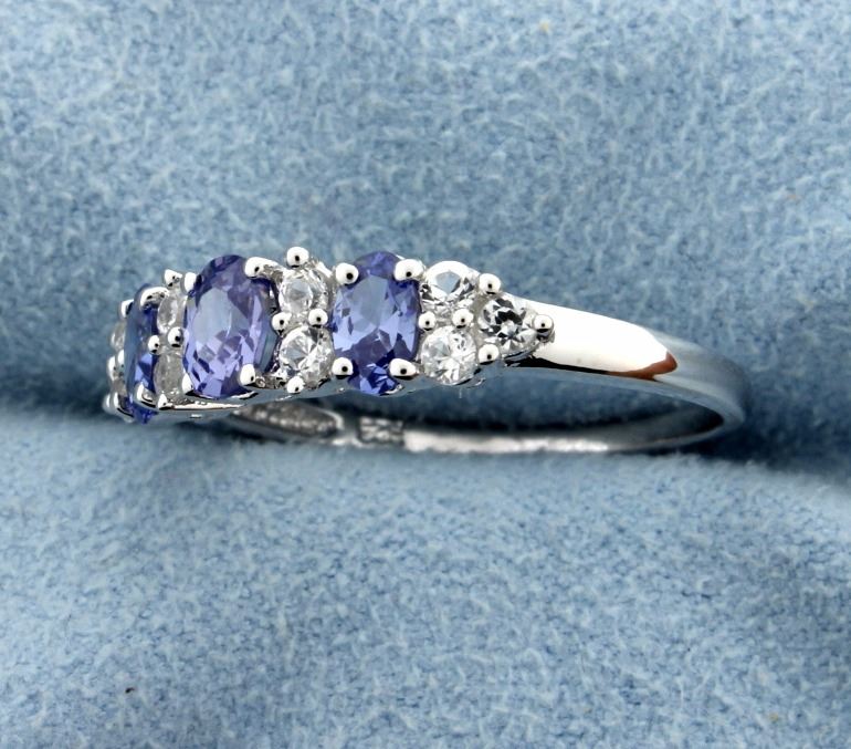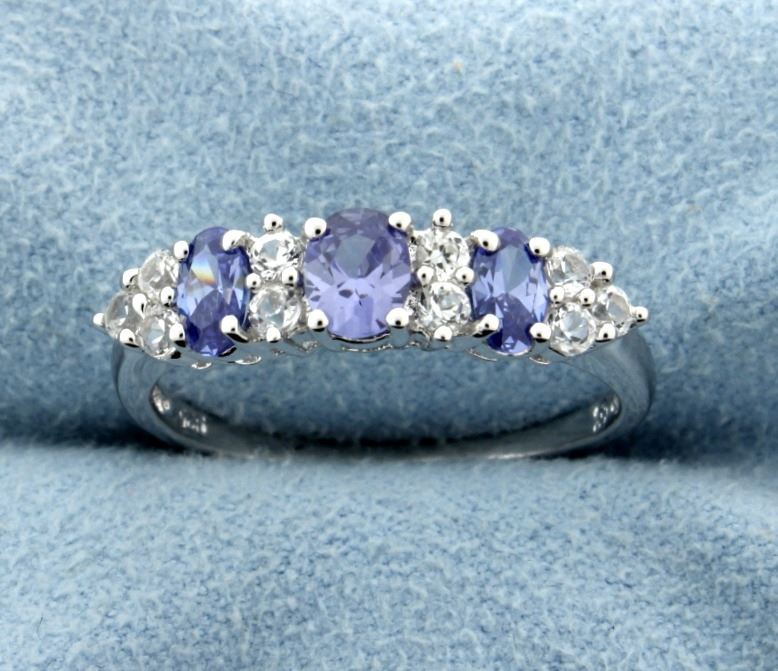 Gorgeous sterling silver ring with stunning lab Tanzanite gemstones and sparkling white sapphires. Size 8 2.0g