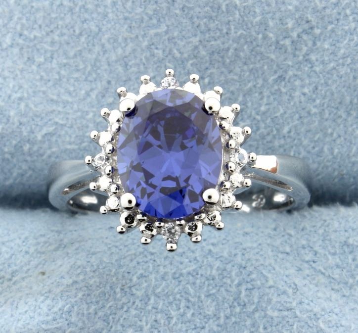 Classic and stunning Princess Diana style ring with fantastic oval cut lab Tanzanite at the center and surrounded by sparkling white sapphires. Size 8 3.4g