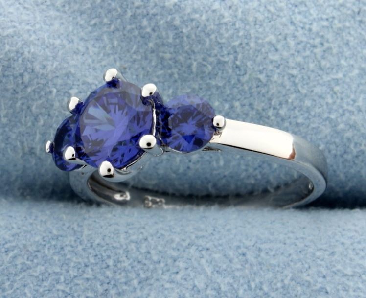 Beautiful and classic, this sterling silver ring has three round lab Tanzanite gemstones. The center is 7mm and the two side gemstones are 4.5mm each. Size 8 3.0g
