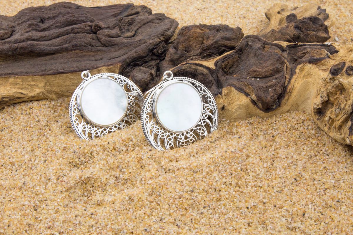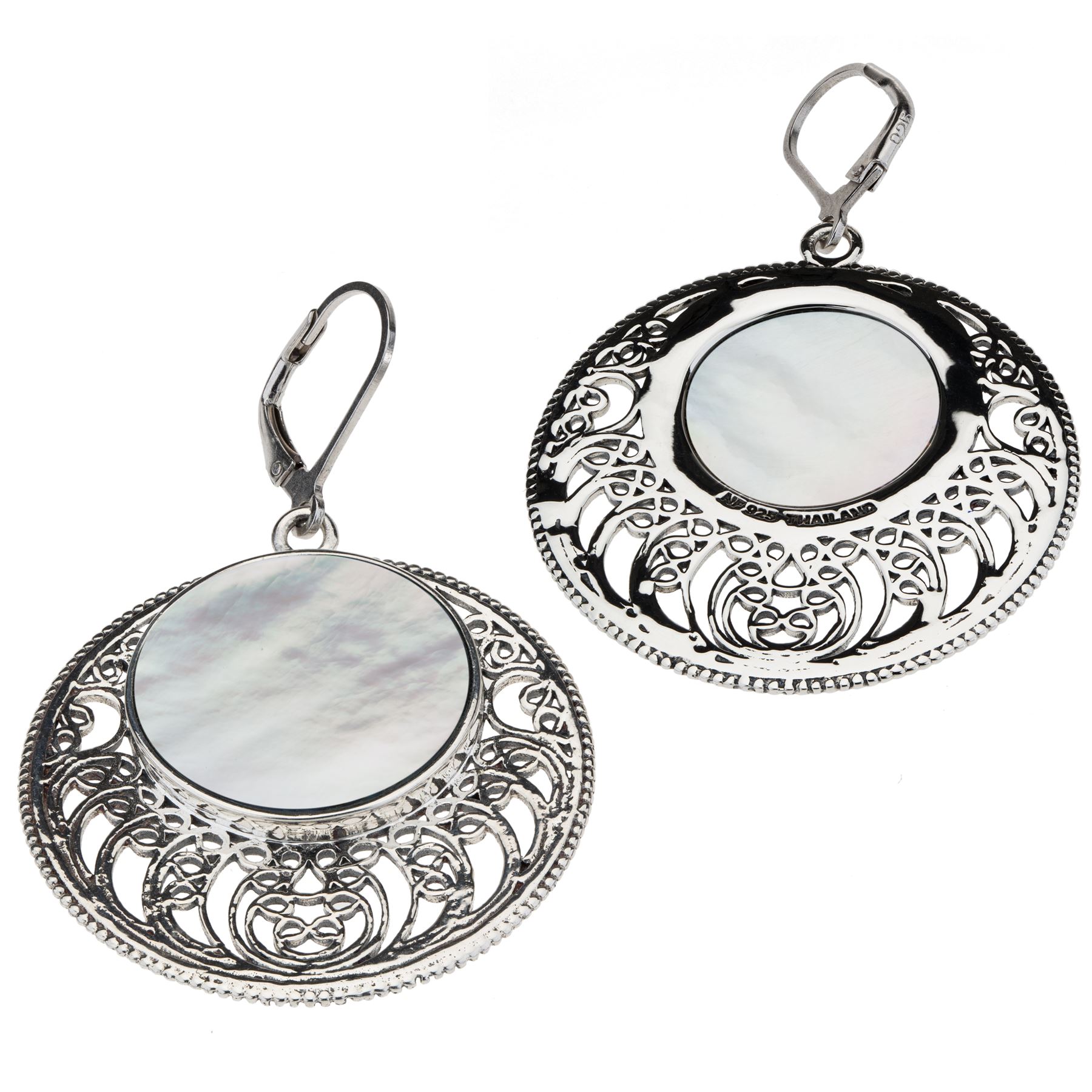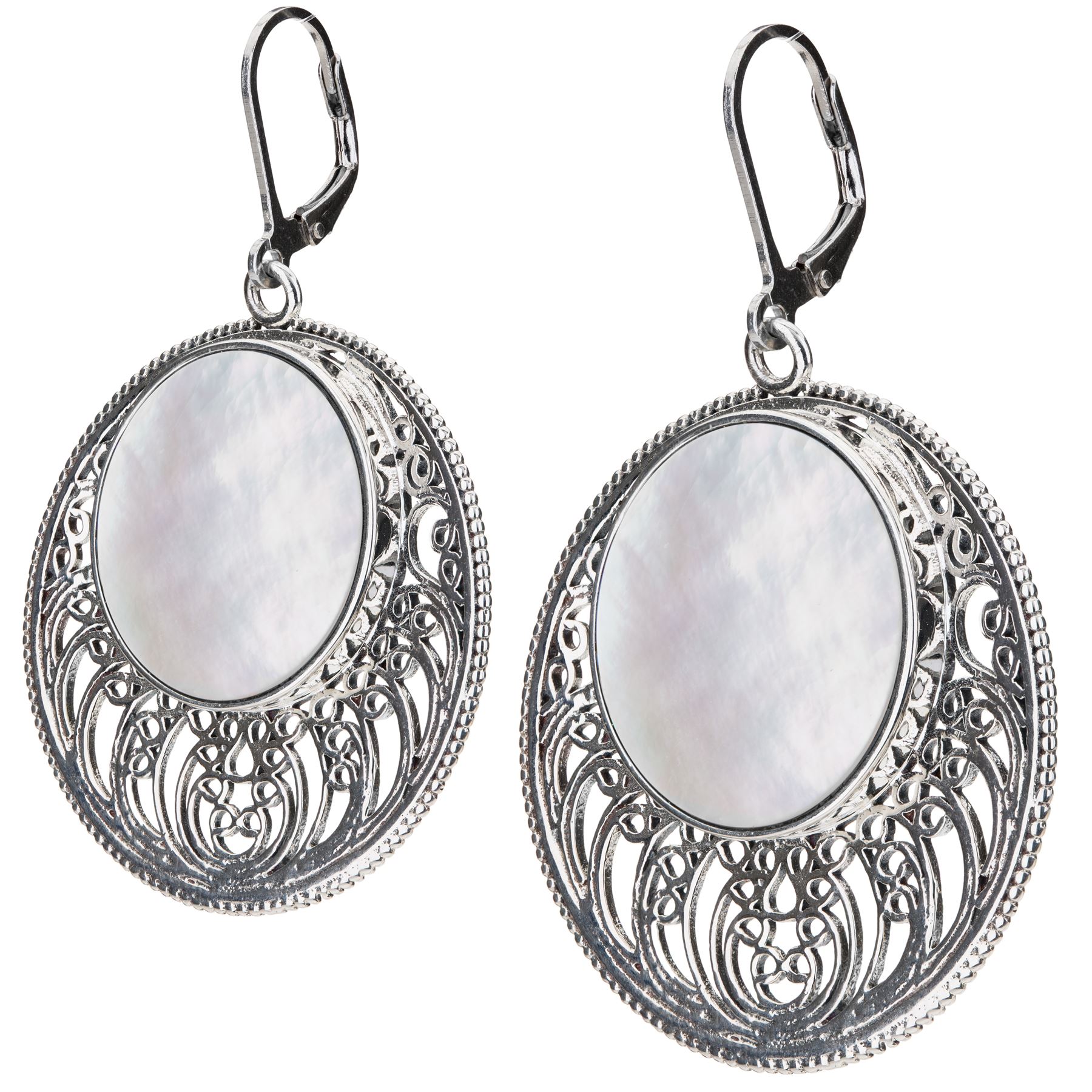 Each earring in the pair showcases one round 20mm genuine White Mother of Pearl surrounded with a scrollwork-like open design. The polished rhodium over sterling silver of each drop ensures the pair shimmers as lever backs attach them to your lobes. Everyone likes to be noticed. These earrings are sure to stand out without weighing you down. Metal: Rhodium over sterling silver