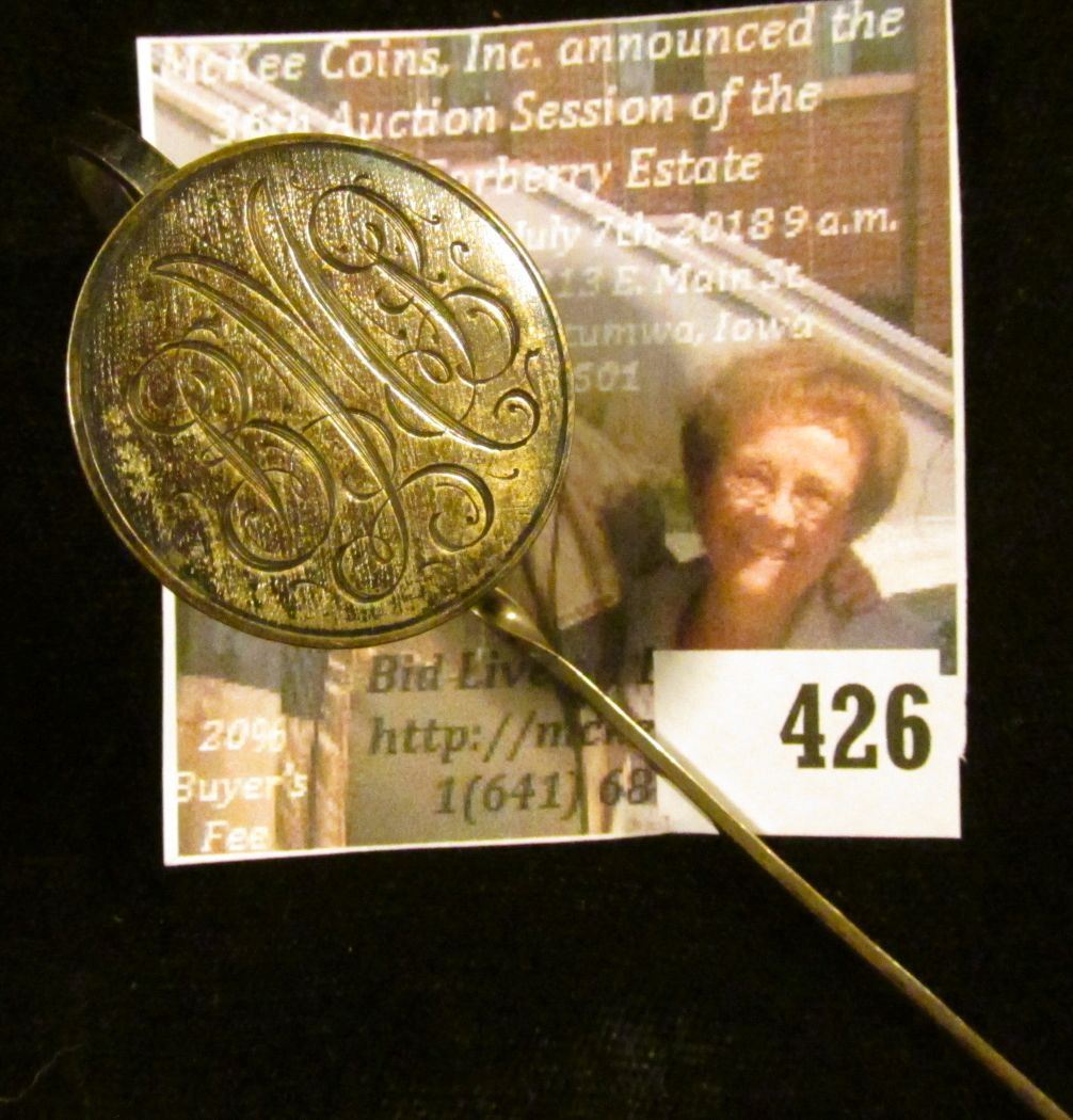 Sterling silver bookmark, engraved disc affixed to a curved, twisted flat piece of sterling. Engraved BML