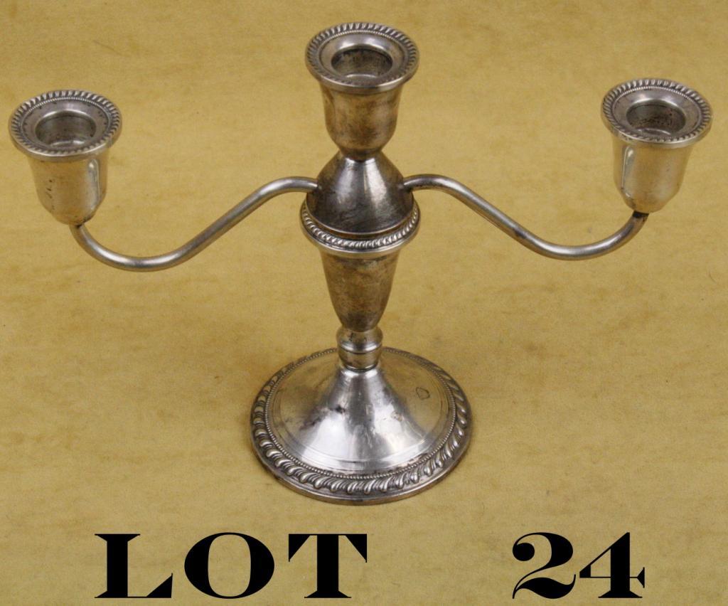 Sterling silver candelabra with three candle positions, approx. 7” high and 10” wide in overall very good condition. Est.: $75-$150.